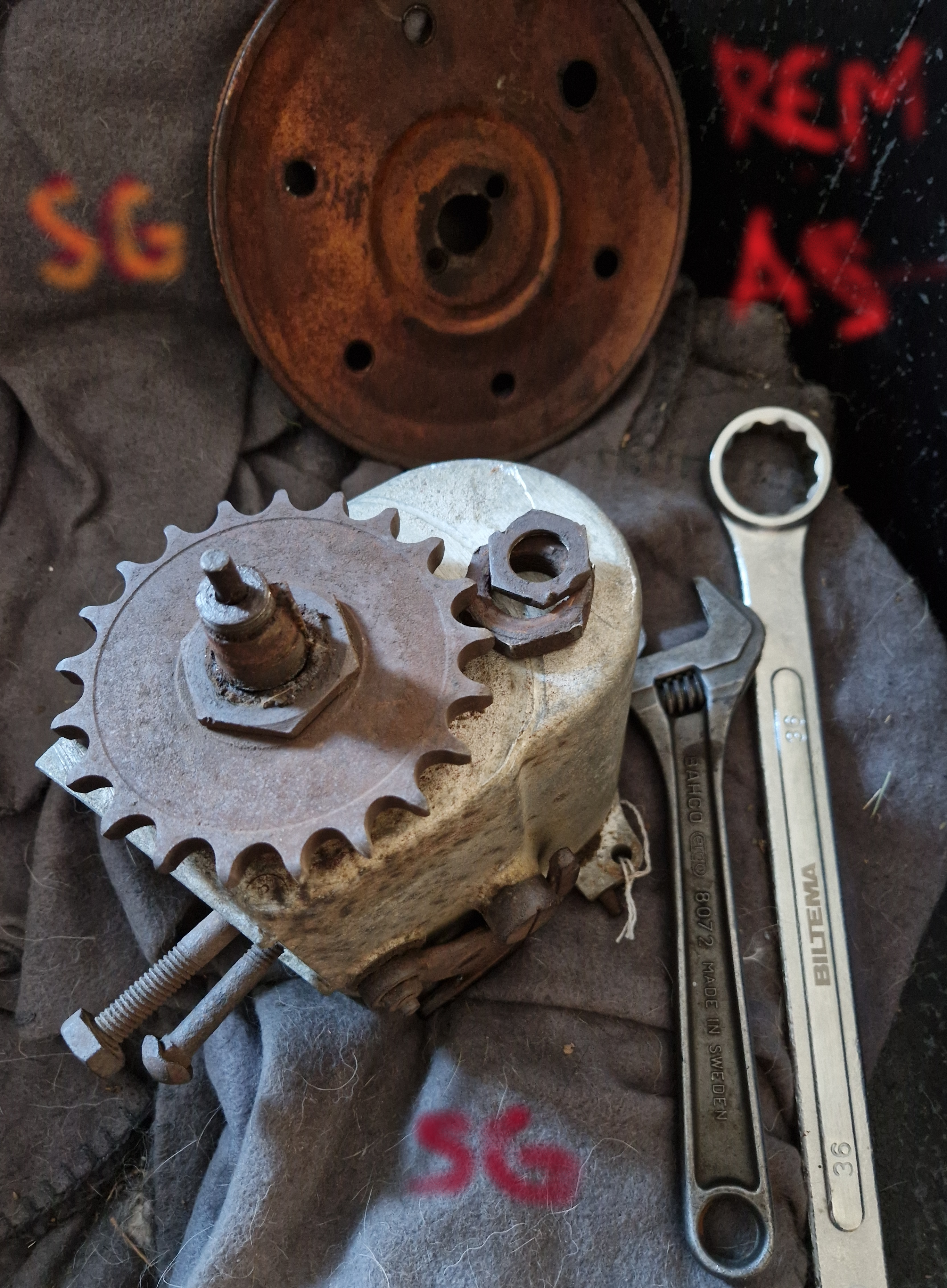 Sen var det bara att loss med en skiftnyckel. Nu har jag två muttrar en stor och en liten samt en kil på axel vilket borde betyda koppling. Blir att gooogla satan ur detta nu.