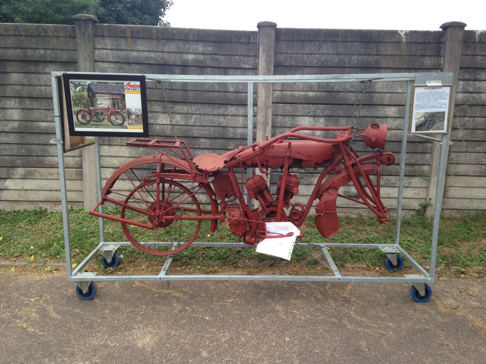 Historien är att 1937 begravde en tidigare ägare av fastigheten, Mrs Bishop, denna motorcykel i en ilska efter hennes sons död, som hade dött när han körde på den. Som man kan förvänta sig av att vara begravd i fuktig Durban-jord så länge, är den helt oåterställbar. Den har grundmålats med en röd rostskyddsmedel för att förhindra att den rostar ytterligare.