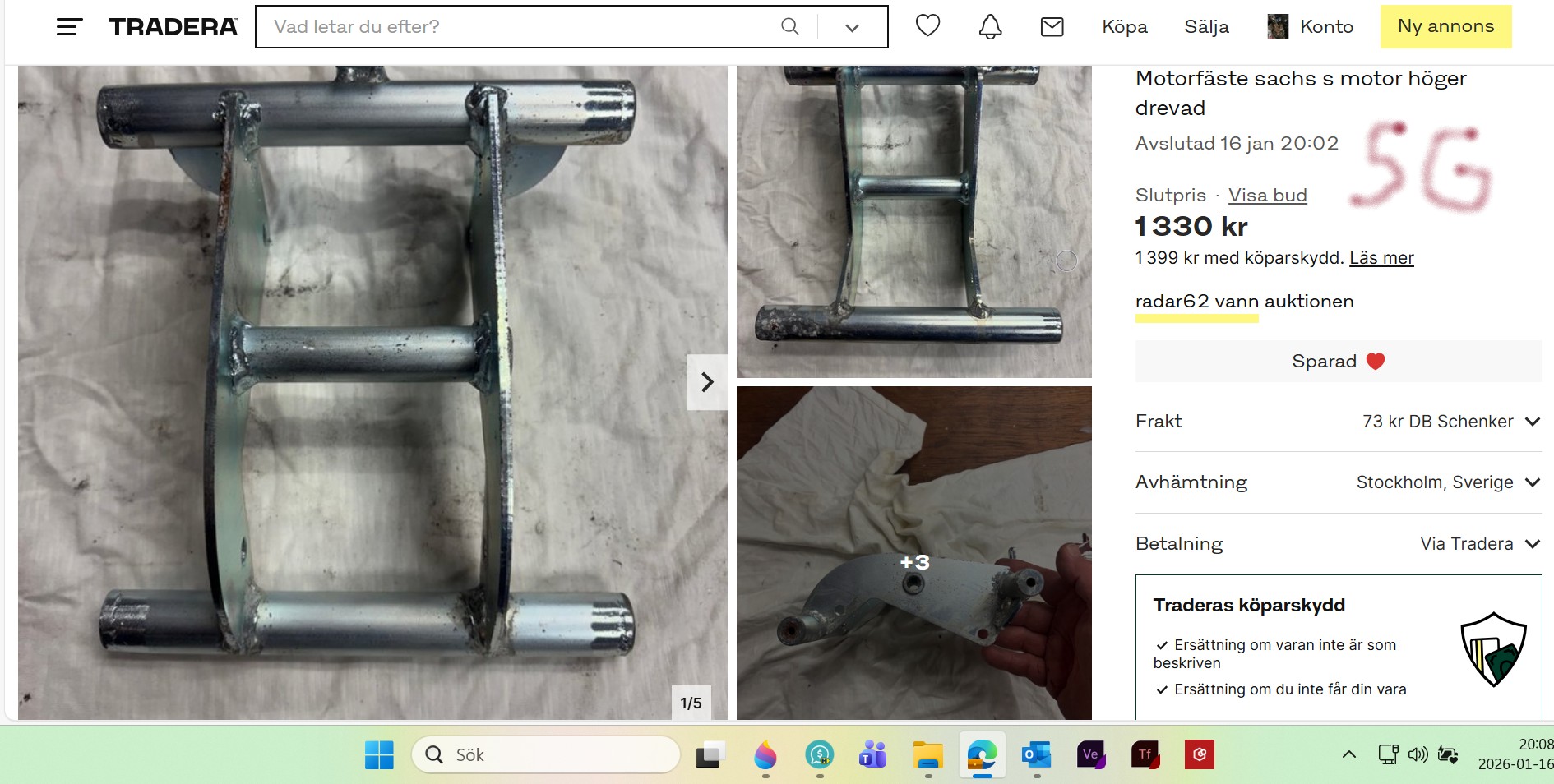Men skärmfästet är bara en bit böjt plattjärn med ett 6mm hål för skruven. Du tillverkar ett på tio minuter och antagligen hade du ändå fått böja och härja med det om det suttit på. Bromspedalen, om du skall använda fästet för vanlig 3-eller fyrväxlad motor, är inte en del i fästet utan sitter på en axel som man stoppar in i ett hål.
