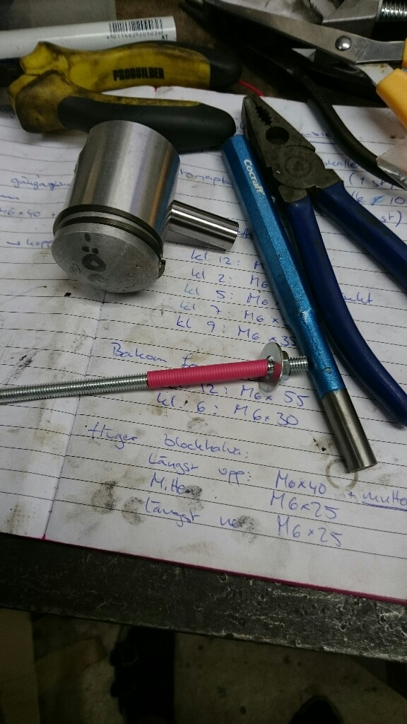 Eftersom jag inte äger något kolvbultsverktyg så knåpade jag ihop ett av lite M6-gängstång vilken kläddes med några cm krympslang, ett par muttrar och lite brickor.