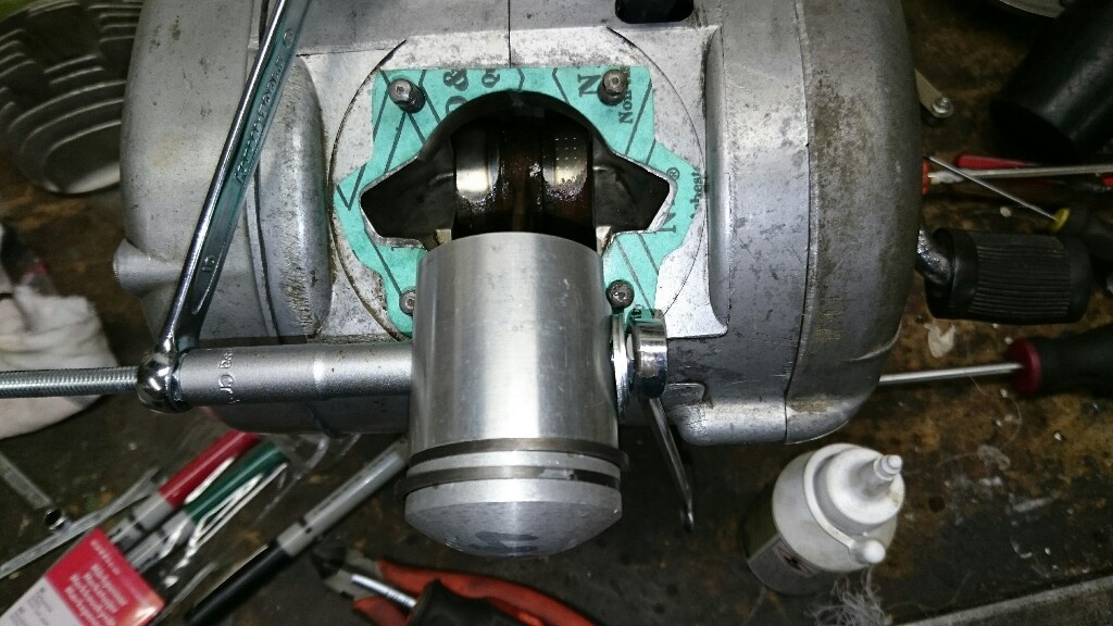 Det fungerade, men inte särskilt väl eftersom det inte centrerade kolvbulten i vevstakens nållager. Således blev det en hel del pill och en och annan svordom innan allt var på plats.