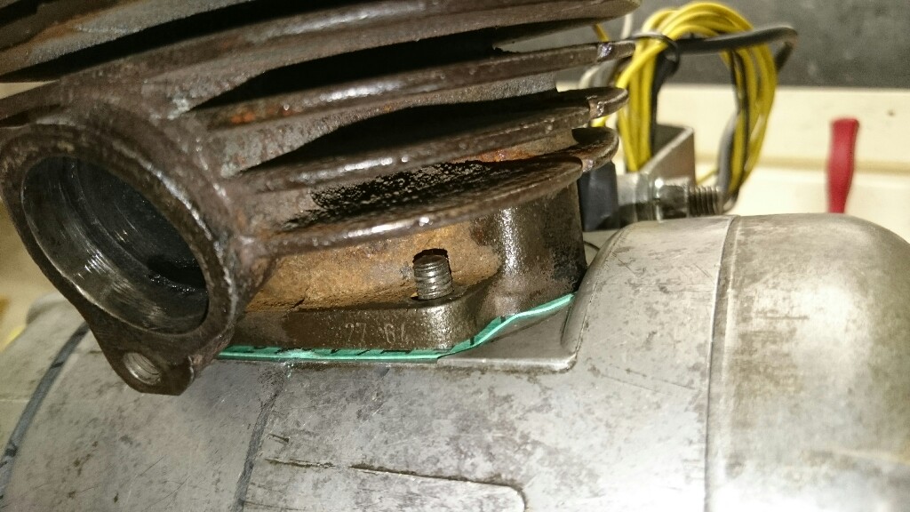 Till sist kunde jag montera topplock, tändstift och tändhatt och prova att dra runt motorn. Ett varv gick bra, men sedan var det stopp(!). Kolven krockar med topplocket. Ridå.