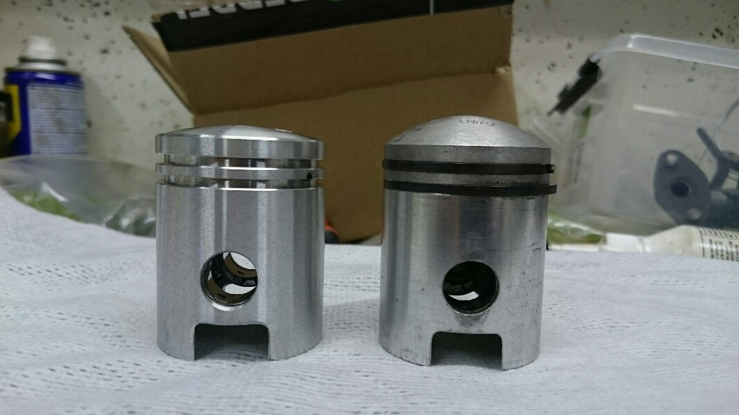 Så här ser kolvarna ut bredvid varandra. De är onekligen lika, bortsett från höjden då. Frågan är om det inte är något slags högkompsvariant som jag fick med trots allt.