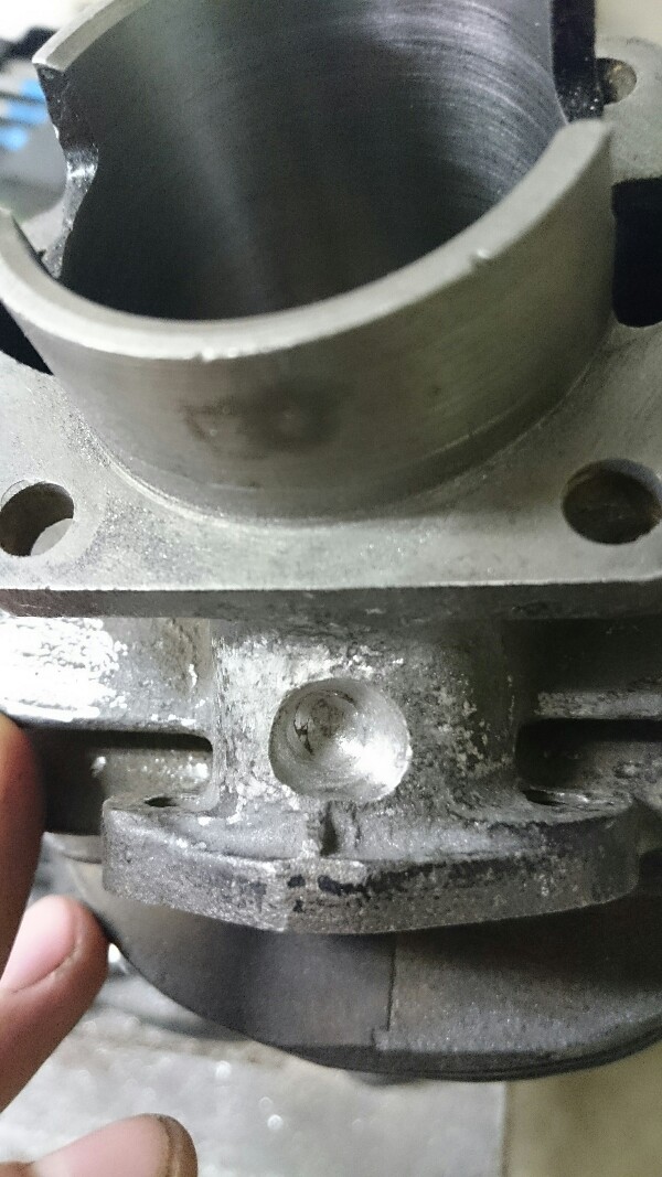 Jag misstänkte det, men blotta vetskapen om att det sitter en strypning i motorn gör mig lite deprimerad. Dessutom är målet gradvis förbättring, så om jag i framtiden ger mig på att jacka kolven så behöver jag inte dra pluggen då. Åtminstone tänkte jag så tills jag började slipa i svetsen som håller pluggen. Så här ser det ut för stunden, efter det att alla mina (lågkvalitets-) slipstift gått åt faders: