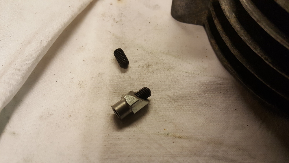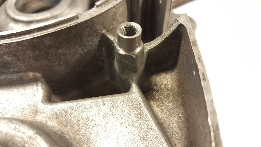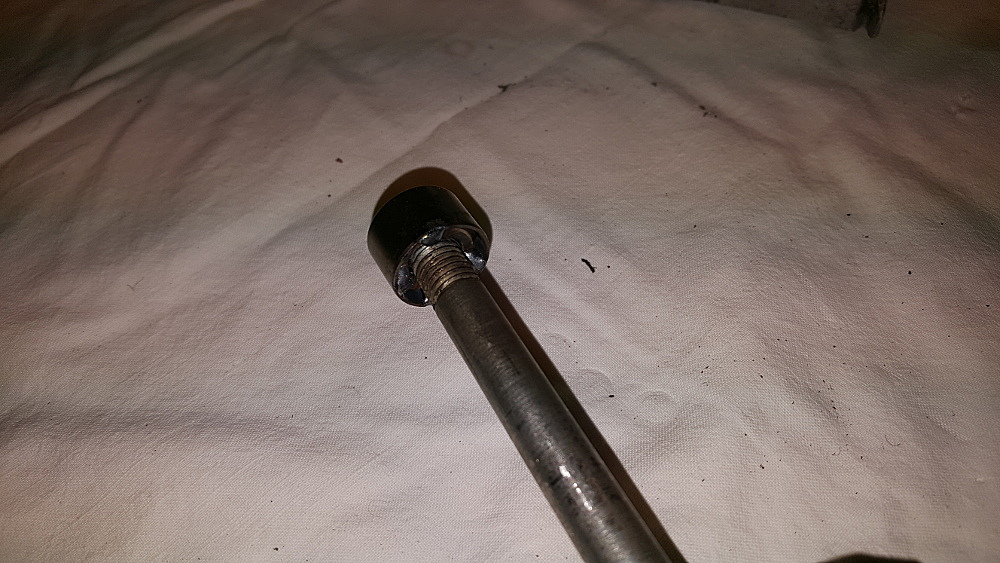 En fästpunkt för kickkåpan var trasig och lagades med en annorlunda metod. Det hade inte varit några problem att svarva till en del i aluminium och TIGa fast den. Men går det att krångla till så är det roligare. Först fylls hålet med JB Weld innan skruven dras ner i botten. Därefter backas halva skruven in i en modifierad skarvmutter av stål. Loctite 270 (permanent) skulle låsa skruvförbandet lika säkert men med JB Weld fick jag möjlighet till en snyggare övergång mellan block och skarvmutter.