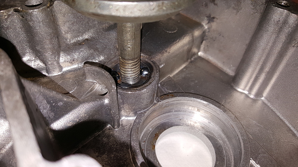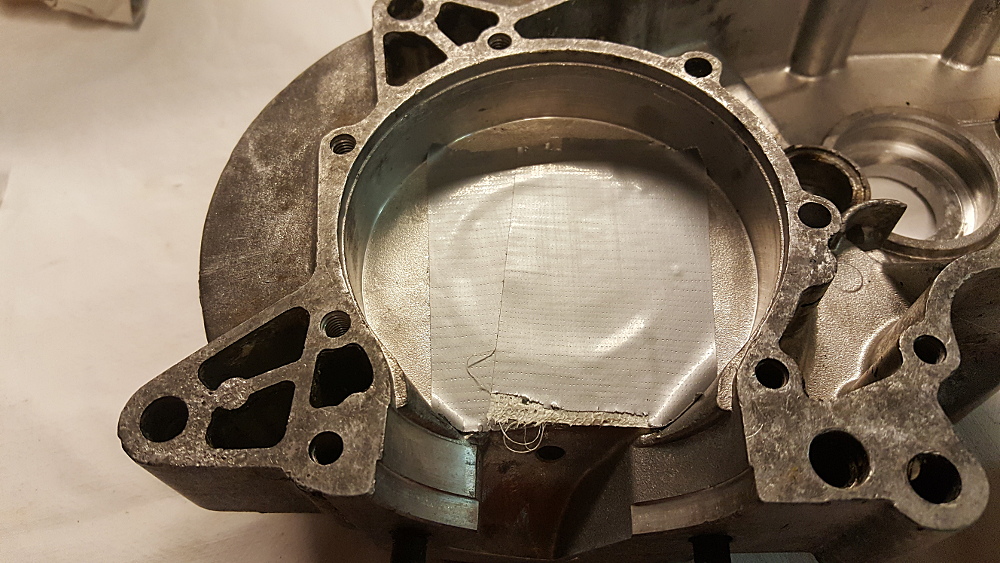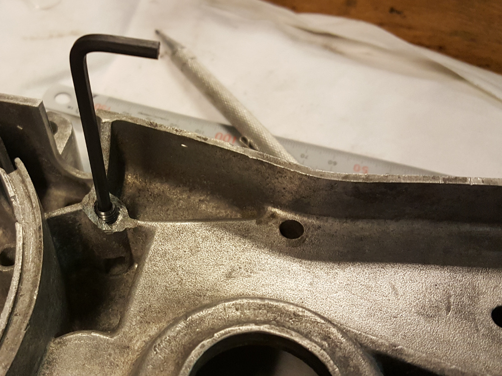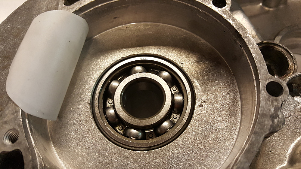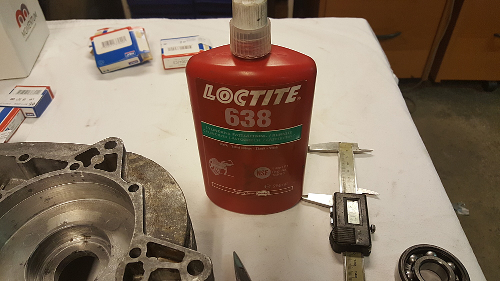 Lagermontering pågår. Men när jag skulle sätta i det högra ramlagret ramlade det ner utan motstånd. Jag brukar inte mäta ytterbanan på ramlagren annat än att kolla att det är rätt dimension. För i går de alltid med hydraulpress när det sätts i alumimium. Ramlar det i utan motstånd får man låsa det med antingen lagerlim eller s.k. cylindrisk tätning. Toleranserna föll sig så olyckligt att det blev ca 1/100 dels millimeter spel och det är ju onödigt att inte fixa till och riskera att det rör sig senare. Egentligen vill man att ramlager ska ha en chans att flytta sig lite när motorn startas första gången för det är inte alls säkert att lagerlägen är 100% raka. Men lagret på andra sidan gick lagom trögt och är inte låst så vevaxeln kommer att kunna lägga sig rätt om det behövs.