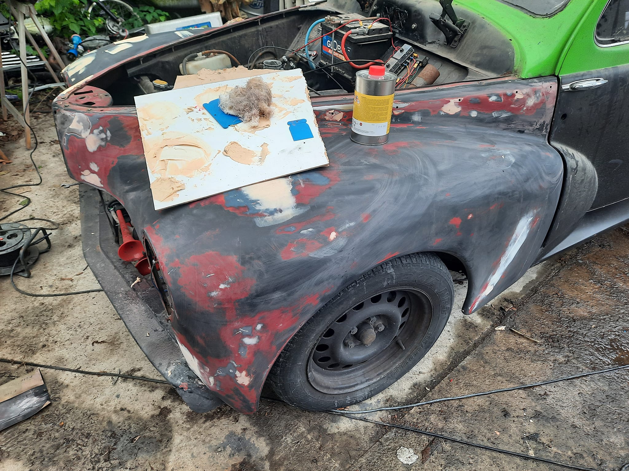 Ändå pissväder idag så gör inte så mycket att tillbringa den i carporten spackla och slipa..