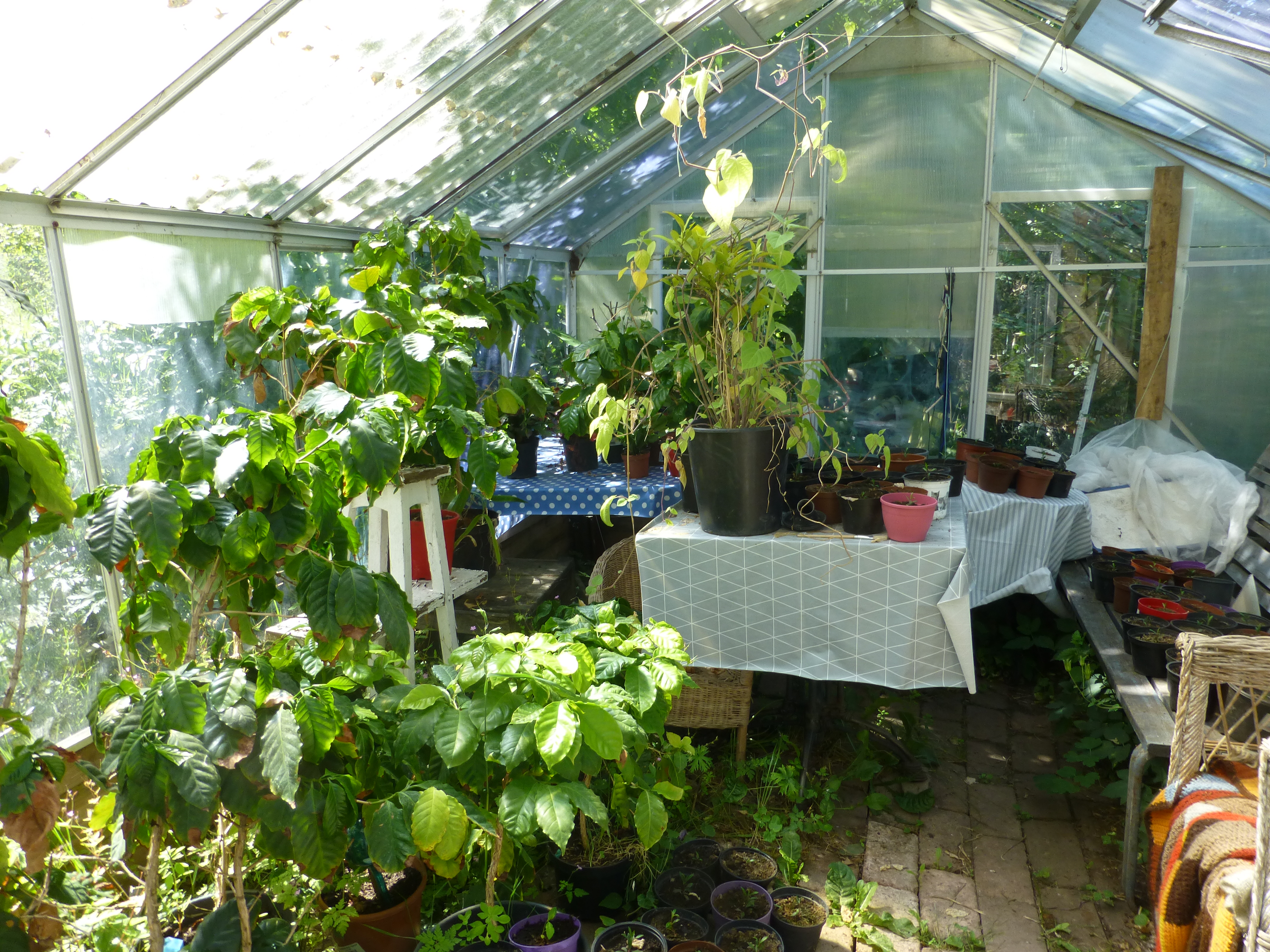 . I det andra växthuset som vi mest har för att fika i i dåligt väder hyser vi Kaffeplantor och en del vi drar upp som fortfarande inte planterats ut. Vindruvorna växer. . Liksom Persikorna. . Och Valnötskörden blir rekordstor i år