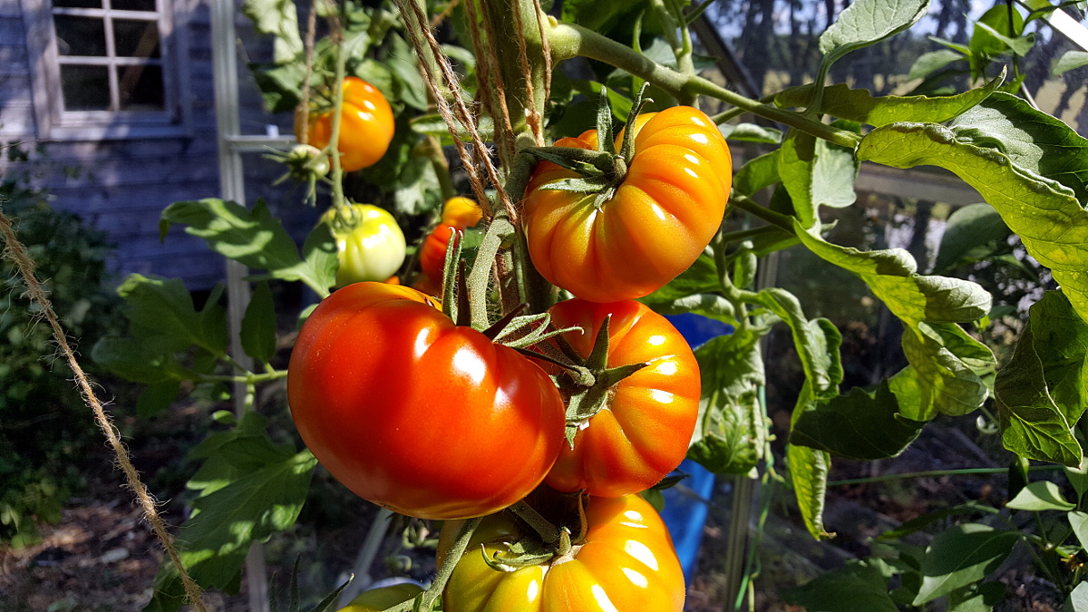 Vi har ju stora rabatter så vi har lika mycket blommor som ätbart.Går åt mycket vatten. Tomaterna i detta växthuset har inte gett så många än, mest de mindre gula.