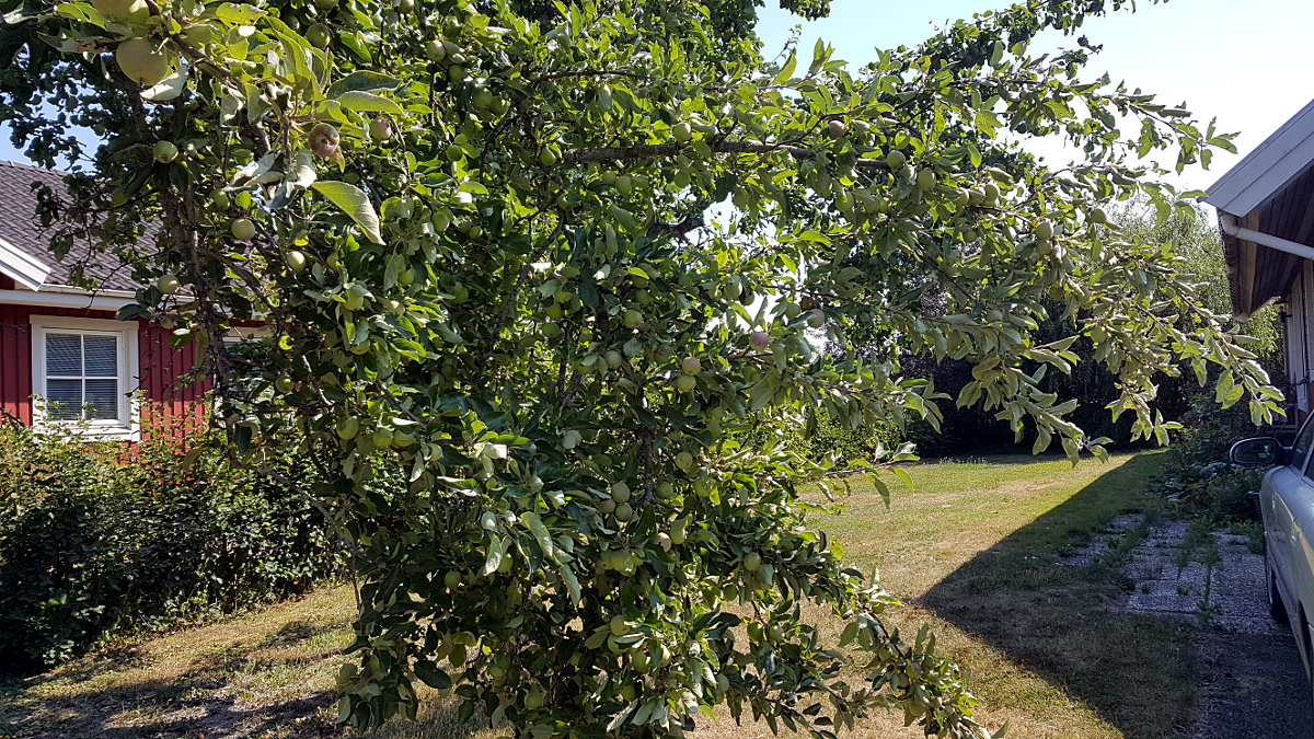 En bekant har sagt att han lägger vattenslangen ett par timmar vid foten av äppelträd då och då och att det gör att äpplena inte blir små som de blir annars vid torka. Jag har trott att det inte gör någon nytta med så stora rotsystem och bladmassa men provar i alla fall nu. Det finns mer äpplen än någonsin tidigare när de planterades i början på 80-talet. Så det vore trevligt om det blir en bra skörd men visst är det mycket regn som skulle behövas. En del grenar hänger ända ner till marken och måste stöttas för att inte knäckas.
