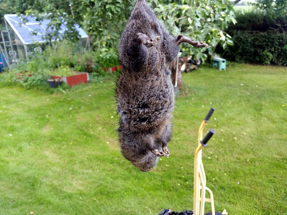 Katten kom in med sin kvällsmat och la den på golvet. Sedan gick han och åt torrisar. Under tiden tog jag ett kort på fångsten och slängde den utanför tomten till behövande skator eller vilka som vill ha den. Den var så pass tung att akterspegeln på den sviktade när man höll den i svansen