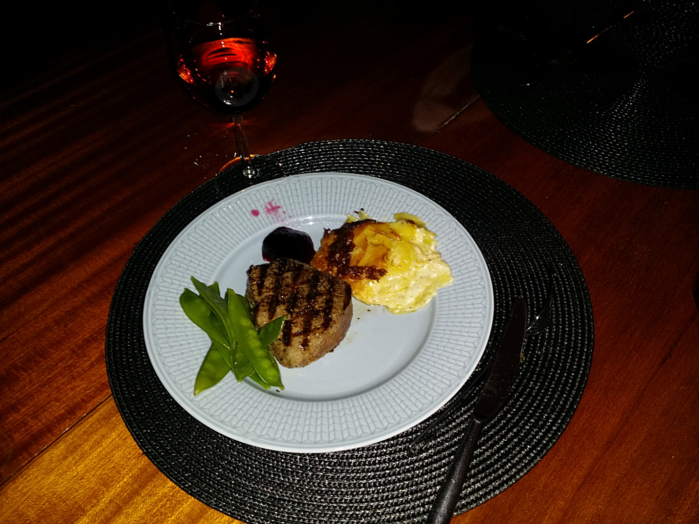Stekt i grillpanna 2 minuter per sida efter att köttet har fått ligga framme i blivit rumsvarmt. Vinet är ett Rosévin som har legat ett halvår i kylskåpet men det var inte förstört. Till efterrätt blev det hallon och blåbär med vaniljglass.