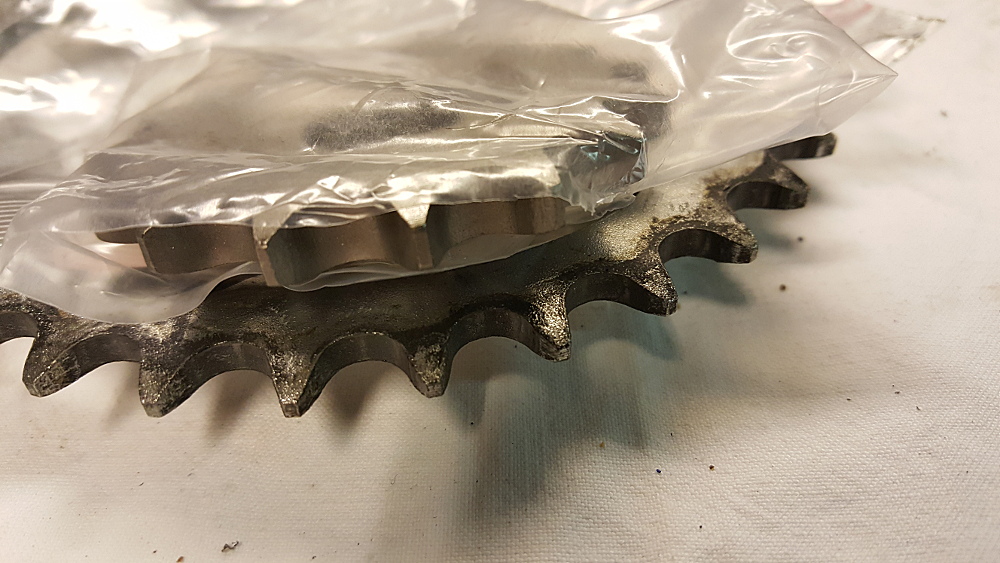 Det kom lite grejor idag som kolv av bra kvalité med L-ring, drevsats och skruvar till motorblocket av hög kvalité. Det nya 428-drevet har lagts på ett vanligt 415-drev för jämförelse.