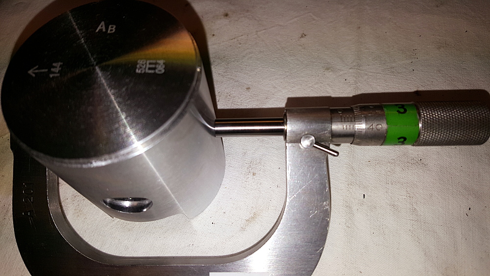 Bilden på kolven visar en jämförelse med en standard KS50 kolv. Kolvspelet med den nya kolven i en cylinder med 54,00 borrning blir 6,5 hundradelar. Ser att det står 064 på kolven det kanske är spelet mot 54.000 som fabriken har mätt upp. Men även om mina mikrometrar är kalibrerade med CEJ passbitar och visar precis på strecket för rätt hundradel så kan jag förstås inte läsa av på tusendel med den här typen av mikrometer. En halv hundradel d.v.s. att se om man ligger mellan två streck är förstås enkelt men det finns ju även andra osäkerheter så att ta gift på att det stämmer exakt på en hundradel bör man inte göra. Ett vanligt skjutmått även om det är ett mycket bra sådant ger en osäkerhet på ca plus minus 2-4 hundradelar, dels för att noggrannheten inte är bättre än plus minus 1,5 hundradel, dels för att det är svårt att få perfekt anliggning. En bra mikrometer har ungefär 10 gånger högre noggrannhet än ett bra skjutmått.