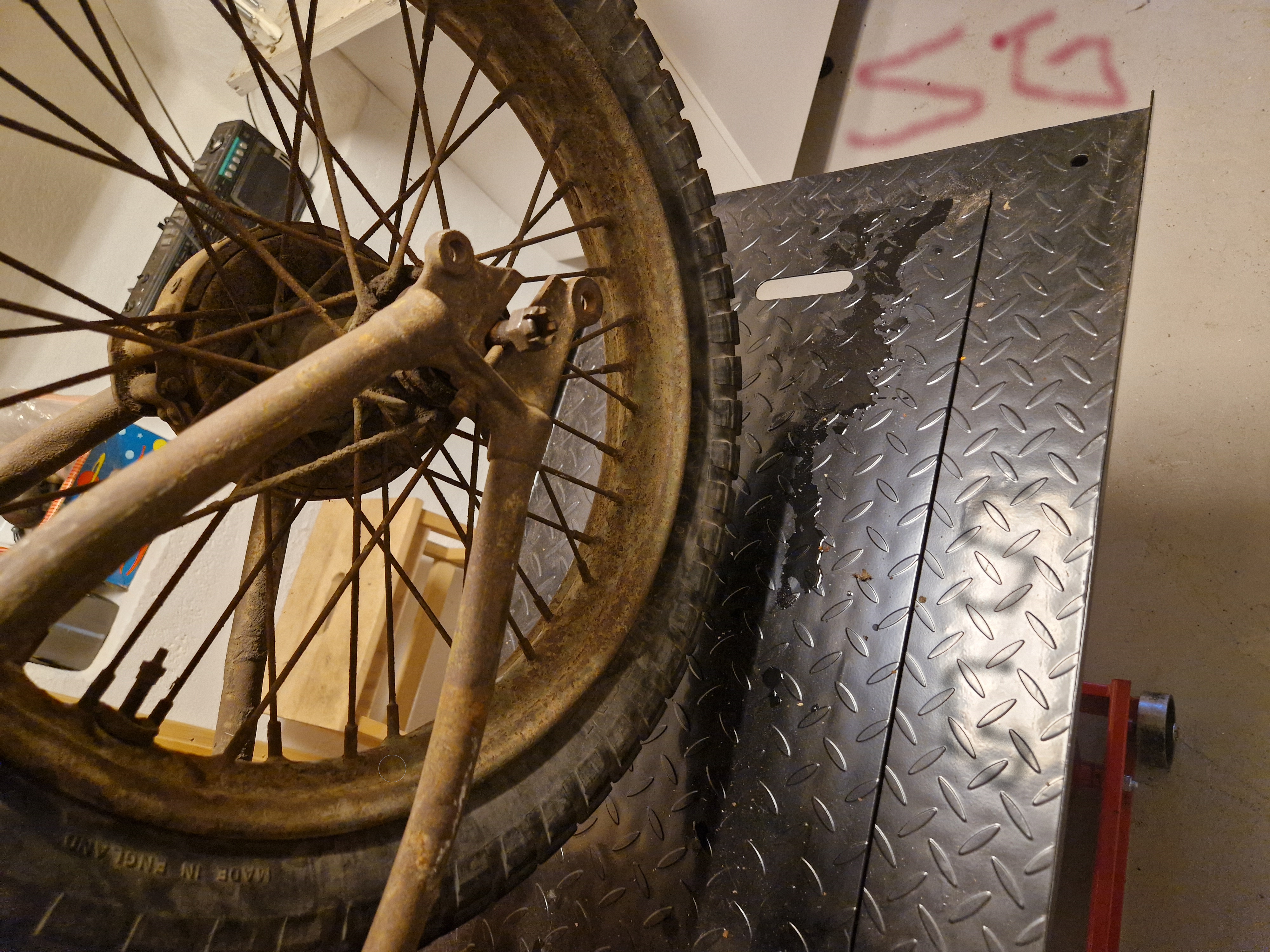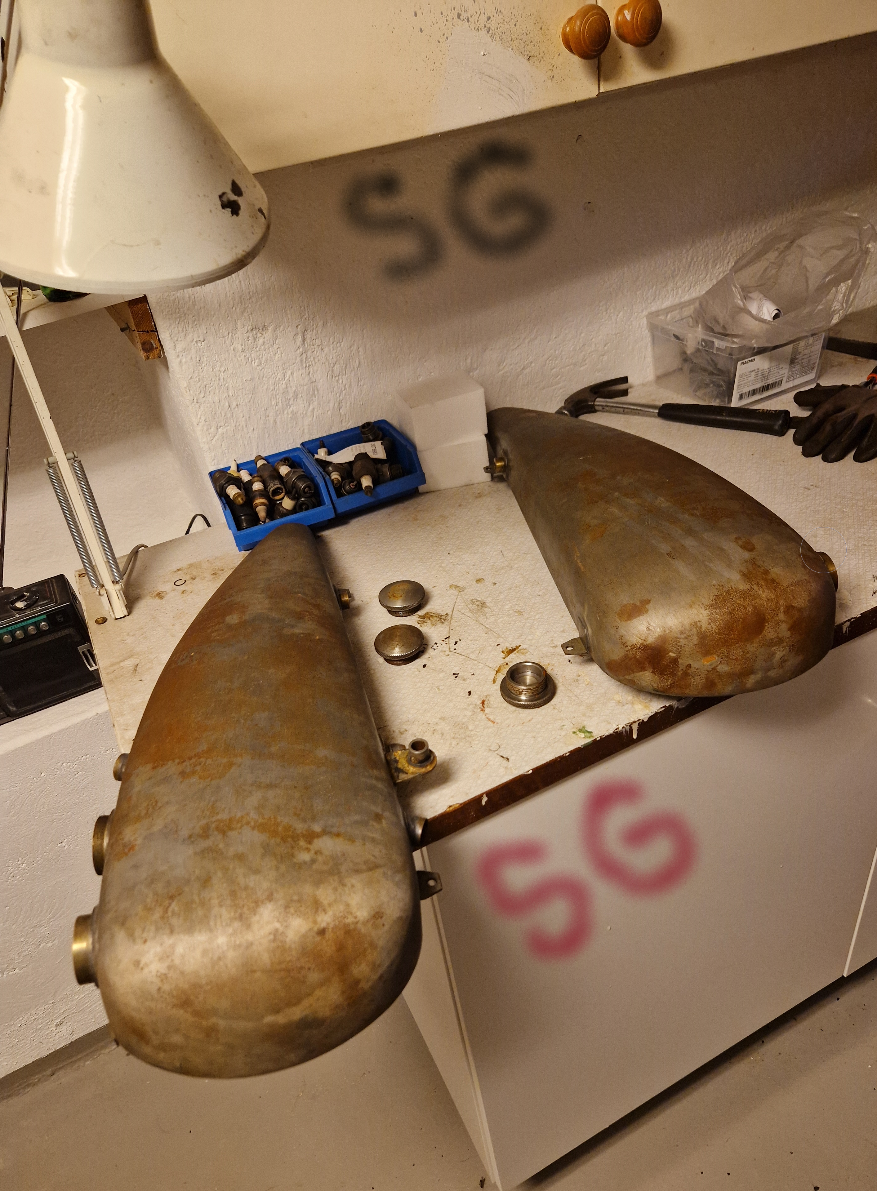 Igår och idag har jag hållit på med rengöring av de dränkta tankarna till Min Harley Peashooter. drog bort allt jag kunde för få så mycket rum att göra rent och få ut ytrost mm. Fy fan vad jag fick ut saker, rost flagor osv, blev mycket mycket på golvet.