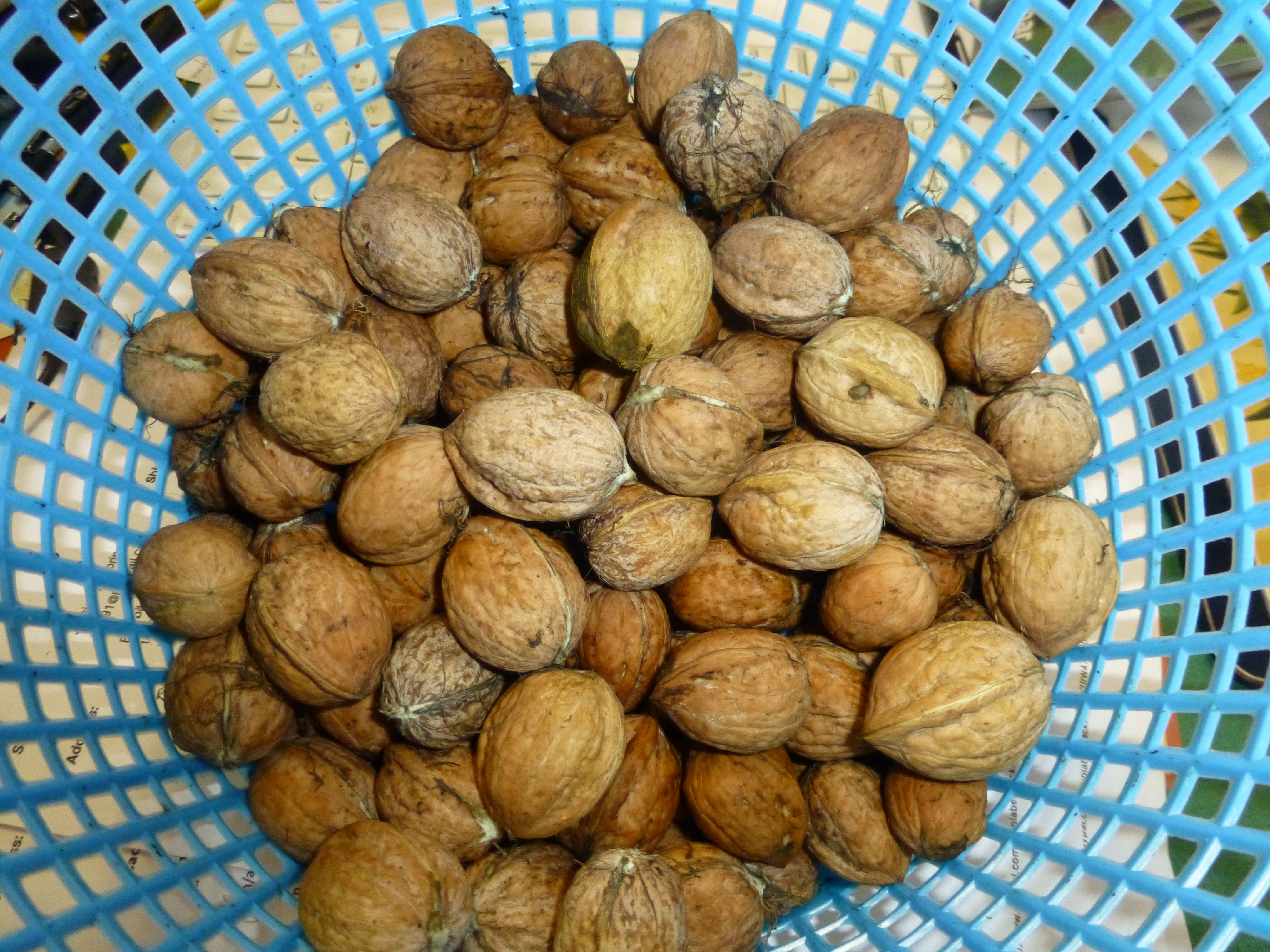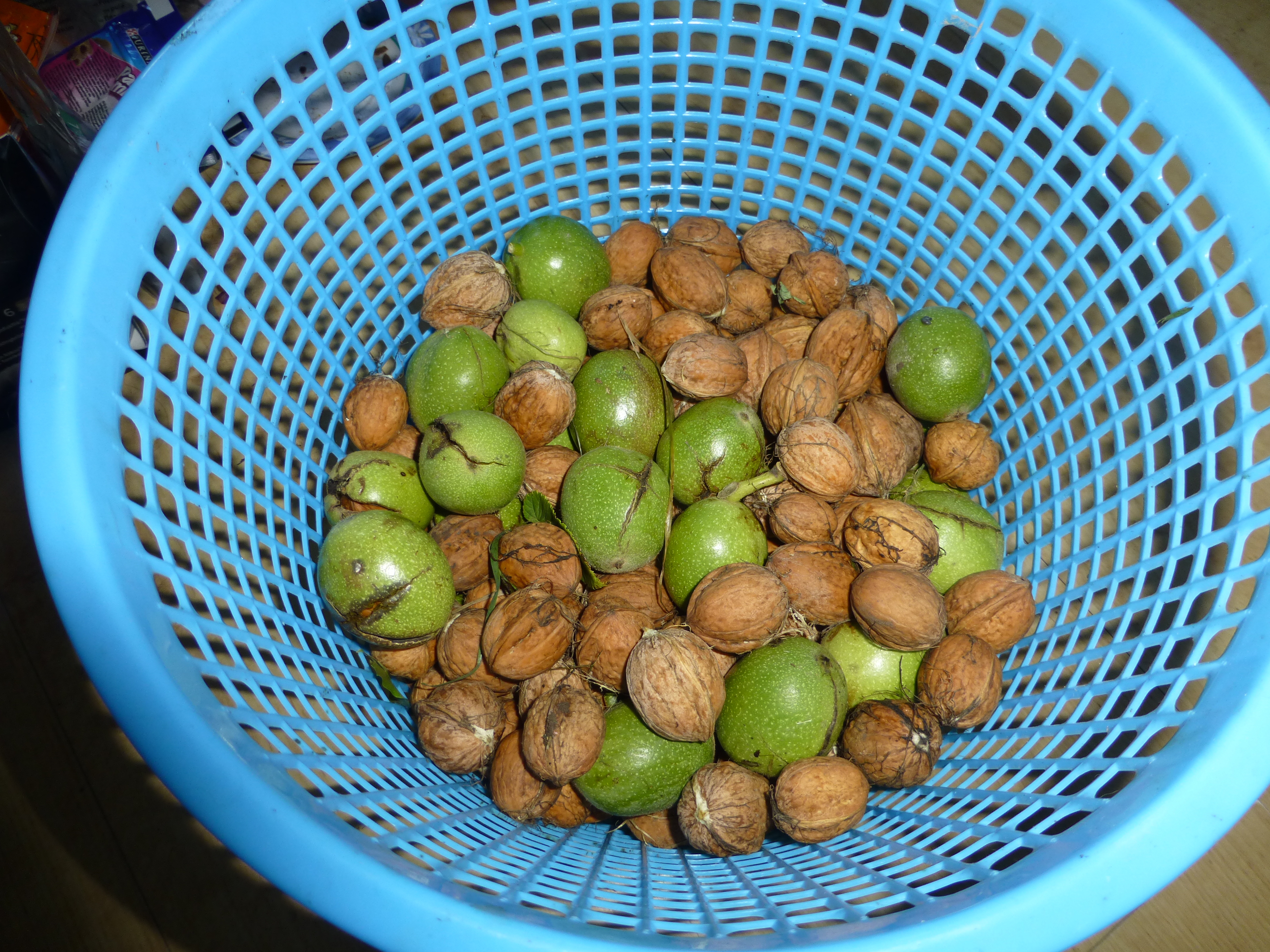 Plockade lite valnötter idag med tanke på att stormen i morgon riskerar att gallra... Tog bara de vi nådde längst ned och de av dom som ytterhöljet hade börjats spricka upp på men fick ändå 7 liter. Här är några av dem: .