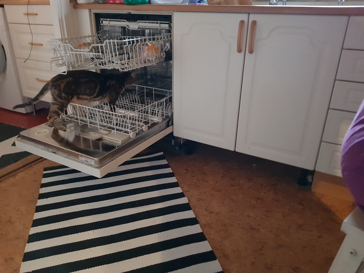Ett par bilder på våra båda älsklingar Siri och Svea. Siri brukar gå in i diskmaskinen en vända efterfrukost. Så idag kollade jag varför hon gör det. Hon går in bakom korgarna och ställer sig på bakbenen så att hon når upp till bestickvåningen och kan slicka av smörkniven på undersidan genom gallret :)