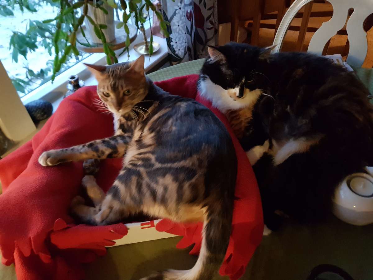 Jag minns när Svea, den svarta katten, kom hit någon månad efter Siri. Svea var hur stabil som helst på en gång. Men Siri var så upprörd att hon skakade när hon såg Svea traska omkring och utforska det nya boendet. Men de rök aldrig ihop då. Det kan de däremot göra nu om vem som ska ligga på en viss plats och stunden efter tvättar de varandra och är bästa kompisar.