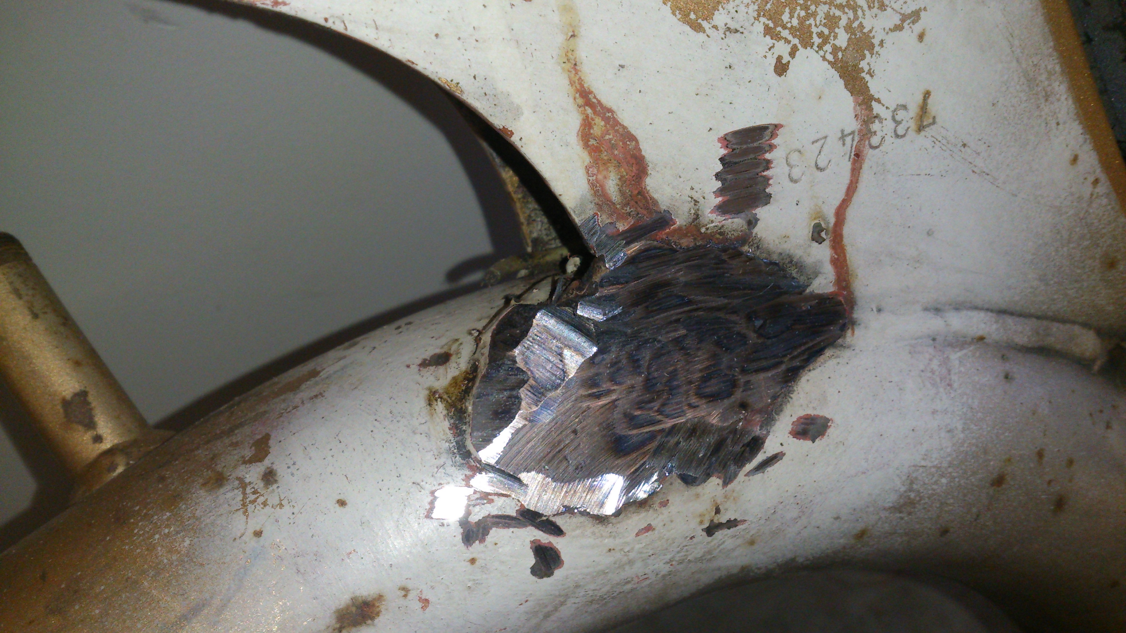 I besvikelsen efter den misslyckade köprundan tog jag mod till mig och började slipa på eländet. Milt sagt har de varit frikostiga med svetsande, gissar att man skulle laga något och brände hål i ramen. Någon annan förklaring kan jag inte komma på.