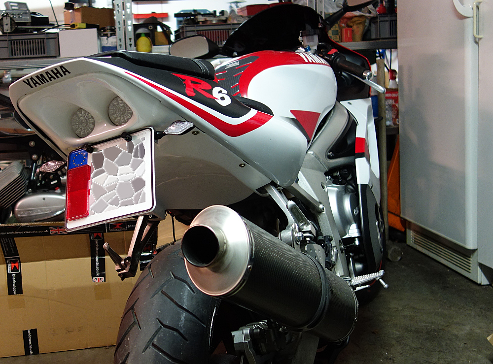 Tillverkning av skylthållare i RF-plåt med fästen för blinkers och skyltbelysning till R6an. Skylten är skruvad upptill med skylbelysnings LEDarna och limmad nedanför med vattenfast kontaktlim för att inte bryta sönder LEDarna och för att skylten inte ska spricka som den lätt kan göra på hojar om den bara sitter med ett par skruvar.