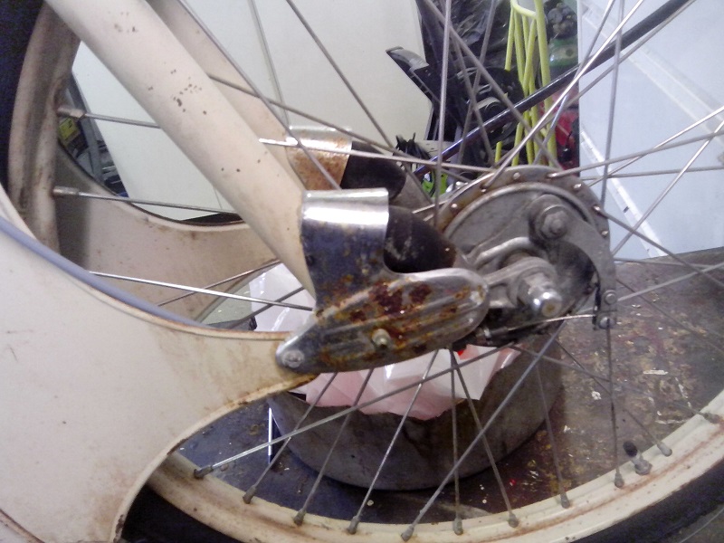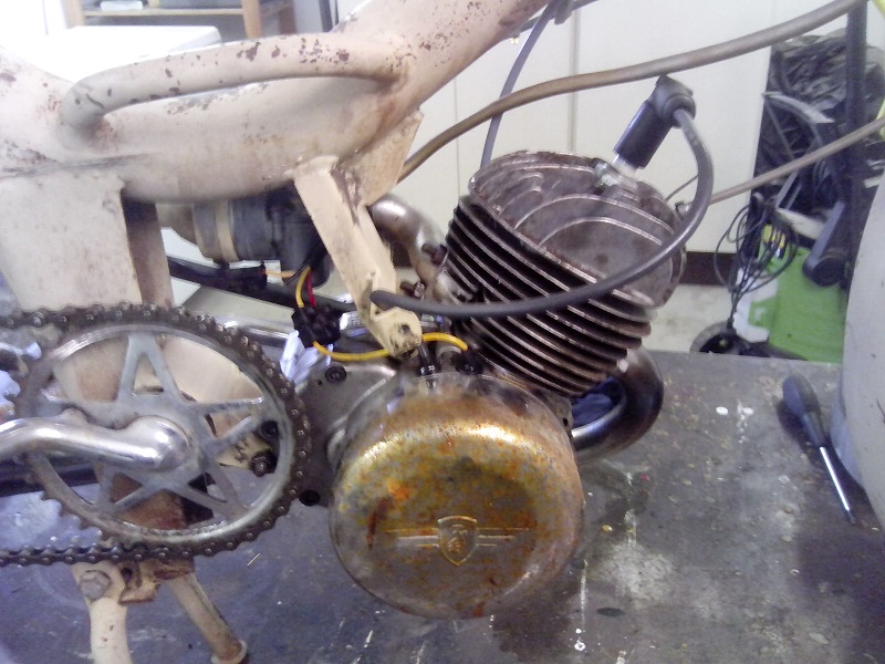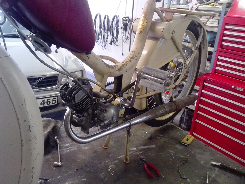 Det första som hände förra helgen är att avgassystemet fick känna på autosol men jag behöver en lite snyggare dämpare. Sen tog jag in sadeln och tog bort skumgummit, frågan är bara vad man ska göra med den nu? Den hade lite fel form för att bara blästra och lackera. Sen skruvades motorn, avgasrör och insug på plats samt att förgasaren skruvades ihop och monterades. En ny cykelkedja monterades. Nu var det rätt tydligt att alla vajrar var dåliga och sämst var gasvajern så den togs bort och en ny uppsättning ska letas fram. Gasrullen var lite lustig med, undrar om det är original eller nån special. Sen har jag fått en tändkabel fastlödd idag så det närmar sig uppstart