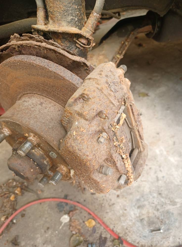 Så hissade högt och lossade bromsok och skivor.. Ja första överraskningen kom på vänster sidan under skivan vart de tomt... japp inget alls..