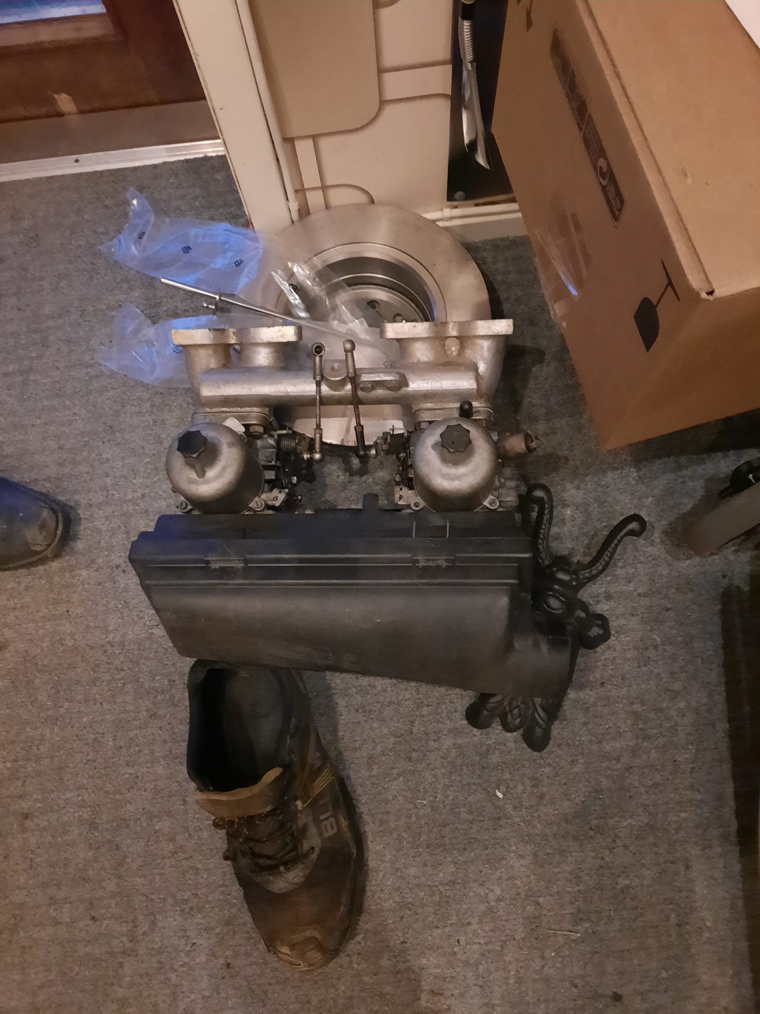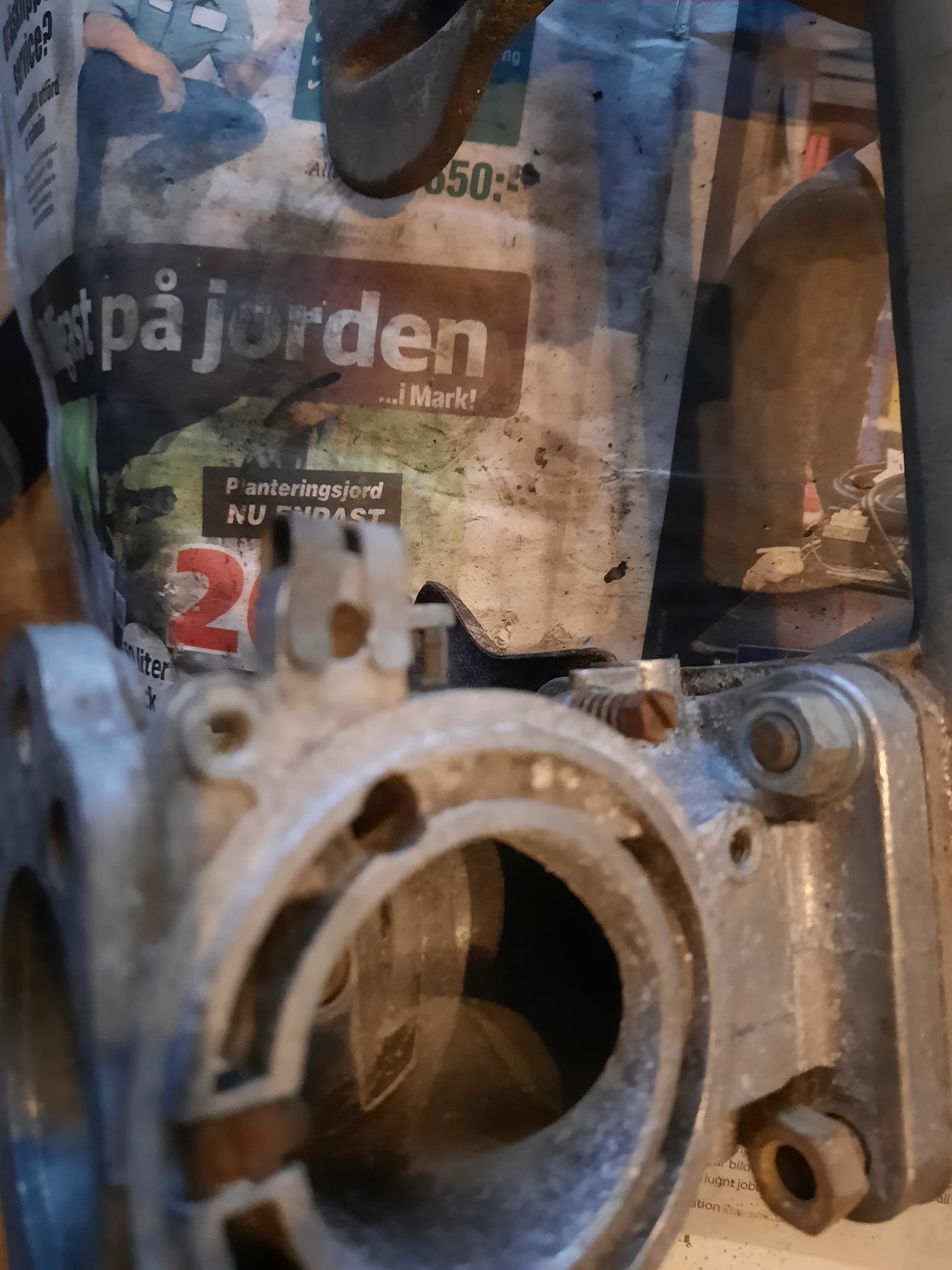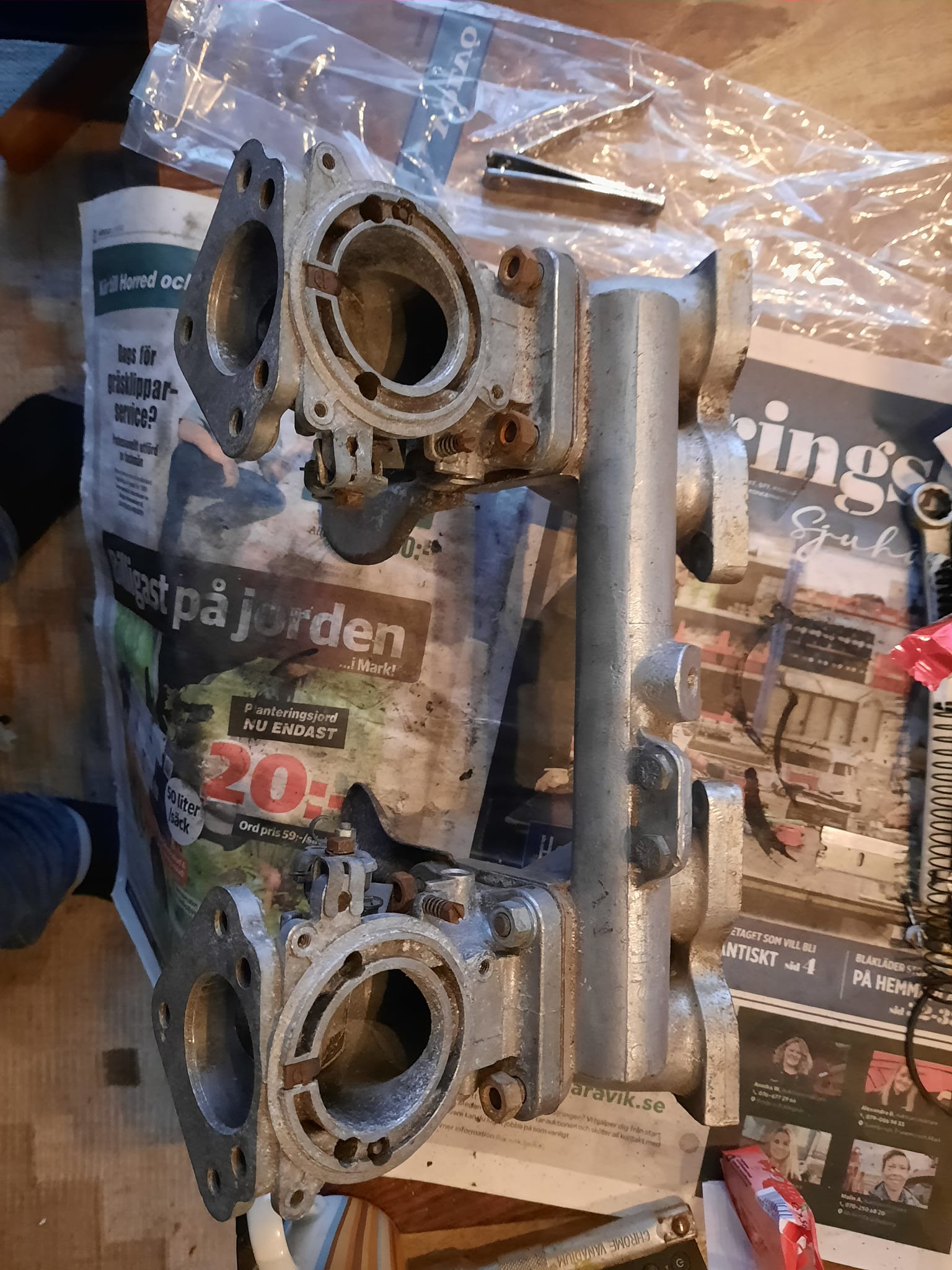 Men bromsar fram påbörjade resten blir nästa veckas bekymmer.. Fick nämligen tips på insug och åkt fyndat ett sådant visserligen i aluminium men bör fungera lika bra. Som ren bonus följde ett par länsade förgasare med på "köpet" men de hade kvar klämmor för chokevire vilket jag saknade innan. men tyvärr saknades gasstagsfästet och de inte riktigt samma som till gjutjärnsinsug. Men vill jag inte bygga om finns dessa nytillverkade.