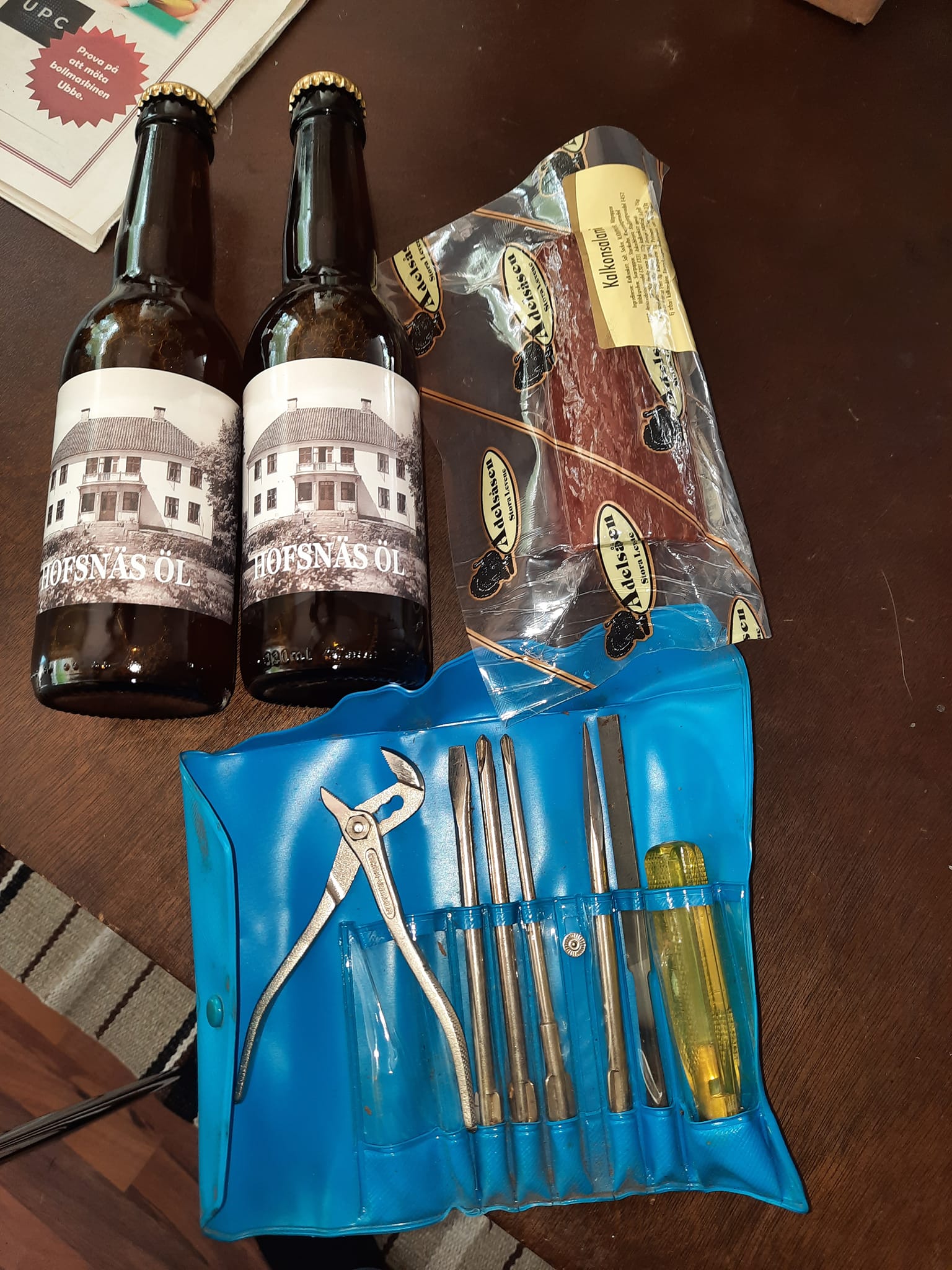 God mat på Hofsnäs Herrgård och fanns såväl gårdsbutik som en hantverksbutik att besöka och en tipspromenad att fördriva tiden med om fina bilar inte räckte. För egen del vart de en salami och ett par intressanta öl inhandlade. Då de även fanns lite bagageluckeloppis fyndades en avdragare samt en ny oljespruta. Men kunde heller inte motstå ett litet 20kr verktygskitt innehållande skaft mejslar pryl magnetfil och en liten polygrip.