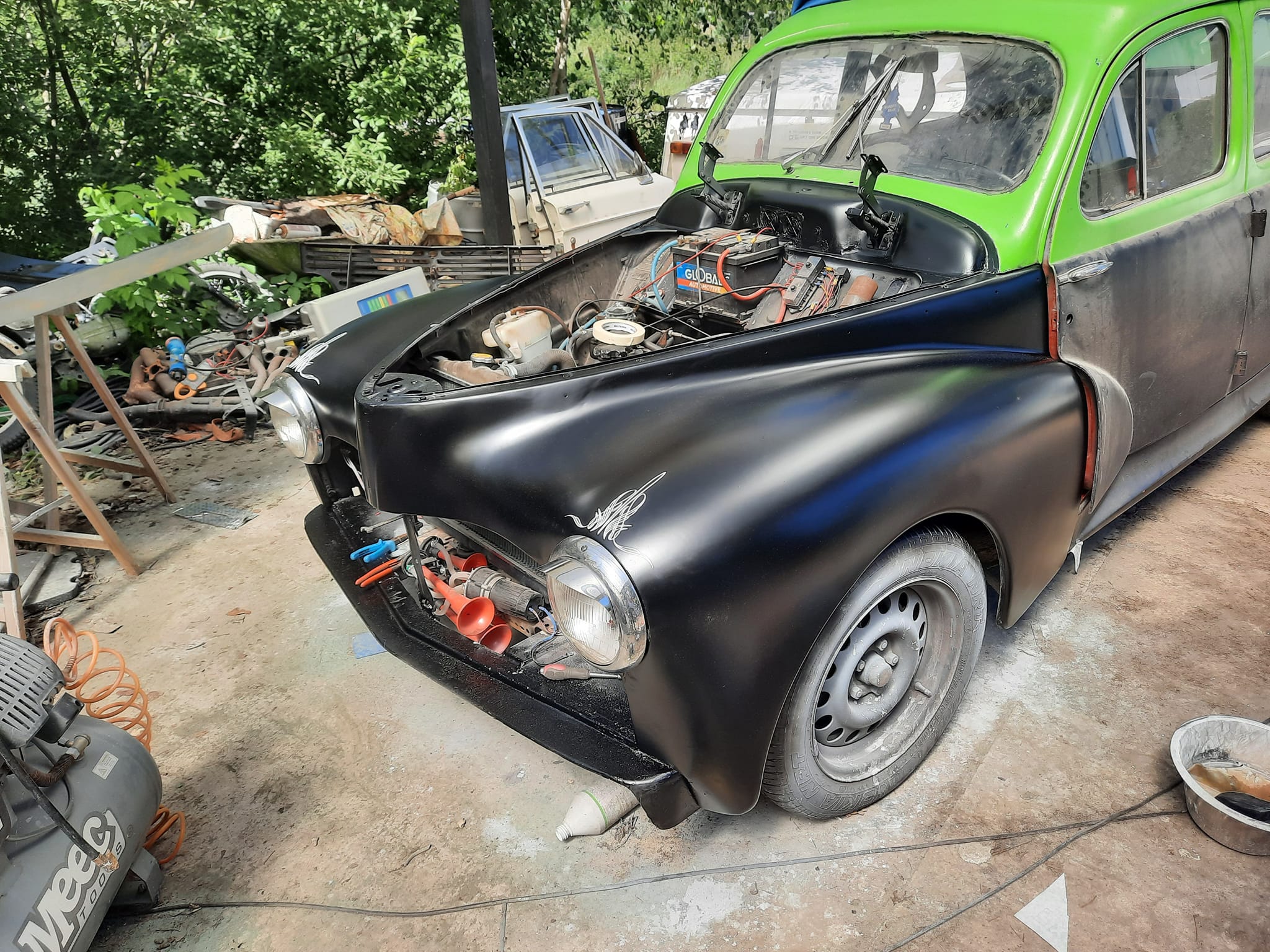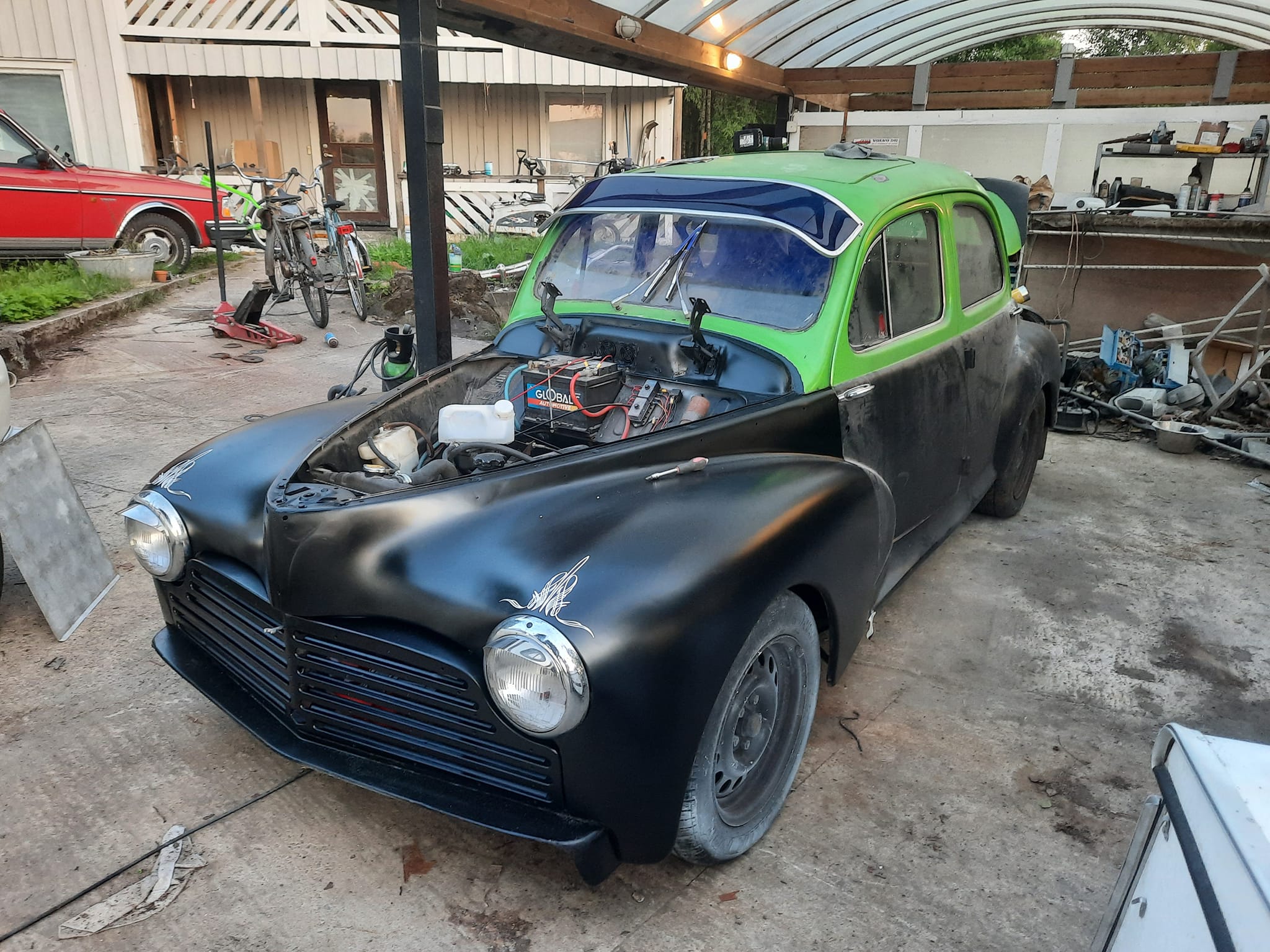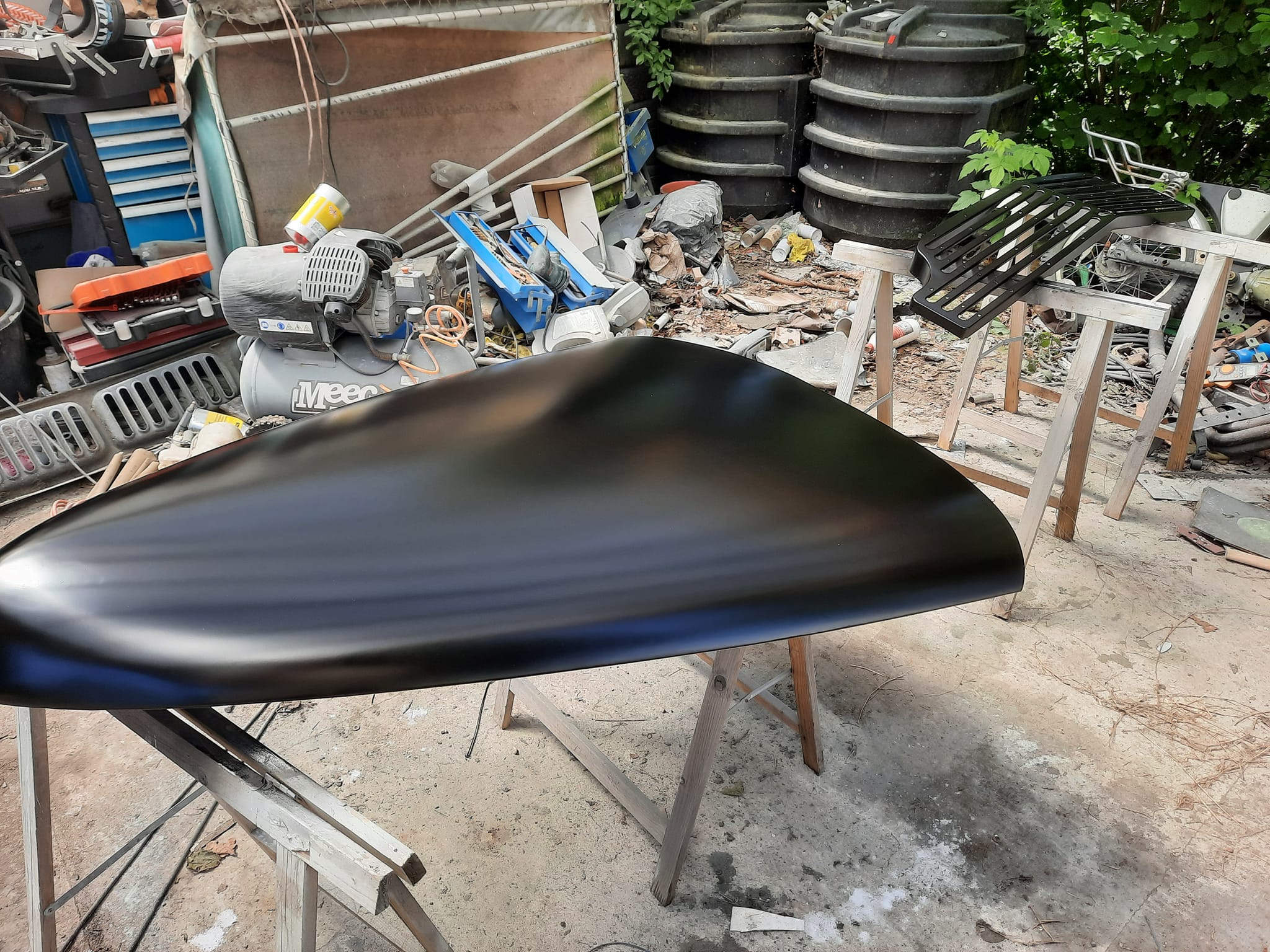 Så sant mattsvart snällt när det blivit matt i alla fall.. visst finns det missar i underarbetet men bilen byggs som kulbil. Så får duga bra mycket seriösare än lack som satt på i alla fall.. nu nos och undersidan av huv svart är lite kattvakt medans det torkar. Hoppas bara han dyker upp så jag kan åka köpa pizza för hungrig nu