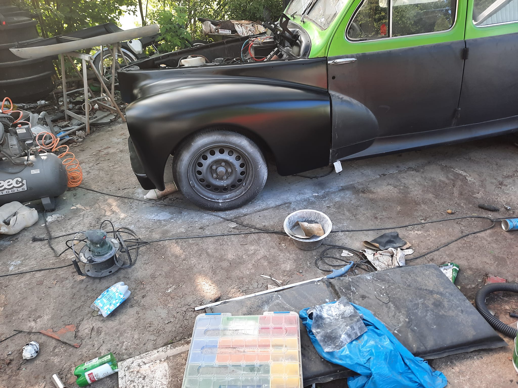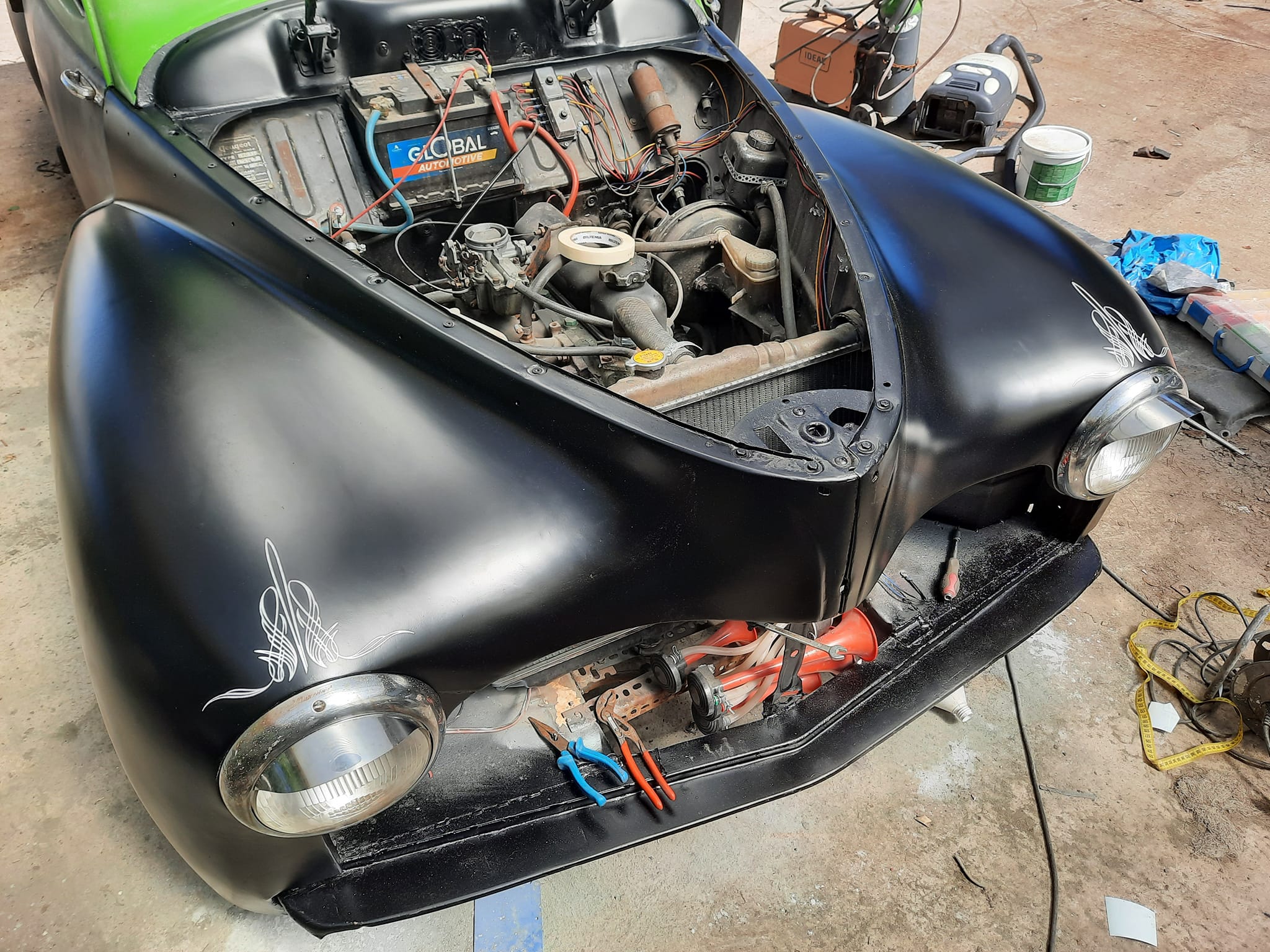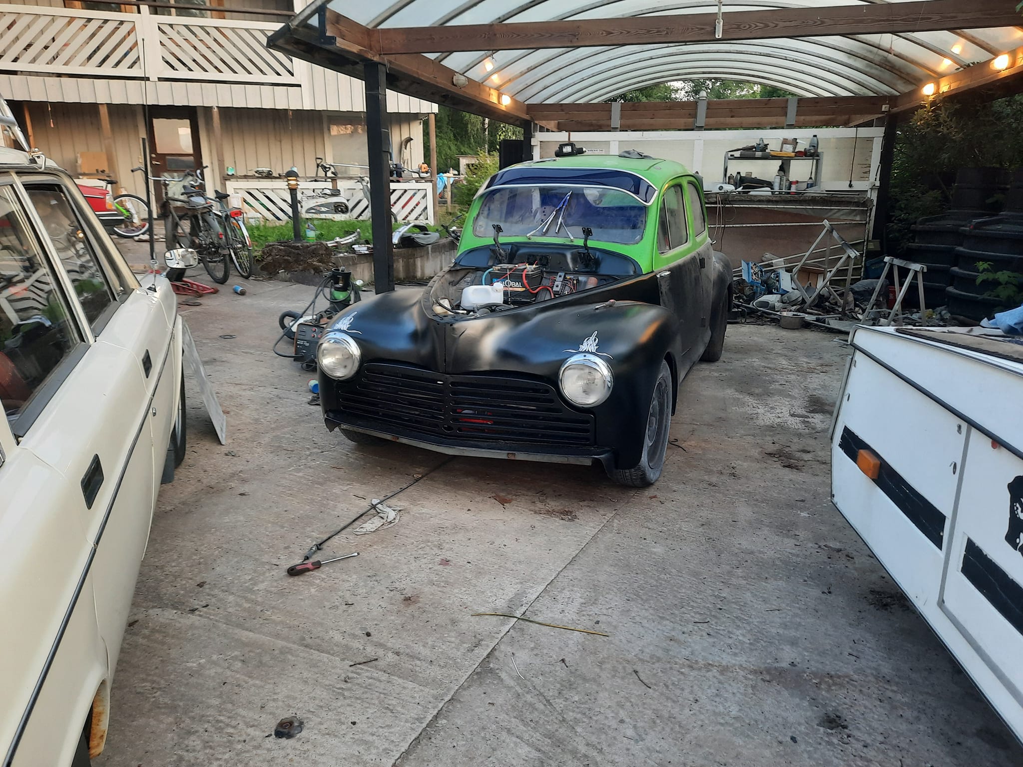 Så sant mattsvart snällt när det blivit matt i alla fall.. visst finns det missar i underarbetet men bilen byggs som kulbil. Så får duga bra mycket seriösare än lack som satt på i alla fall.. nu nos och undersidan av huv svart är lite kattvakt medans det torkar. Hoppas bara han dyker upp så jag kan åka köpa pizza för hungrig nu