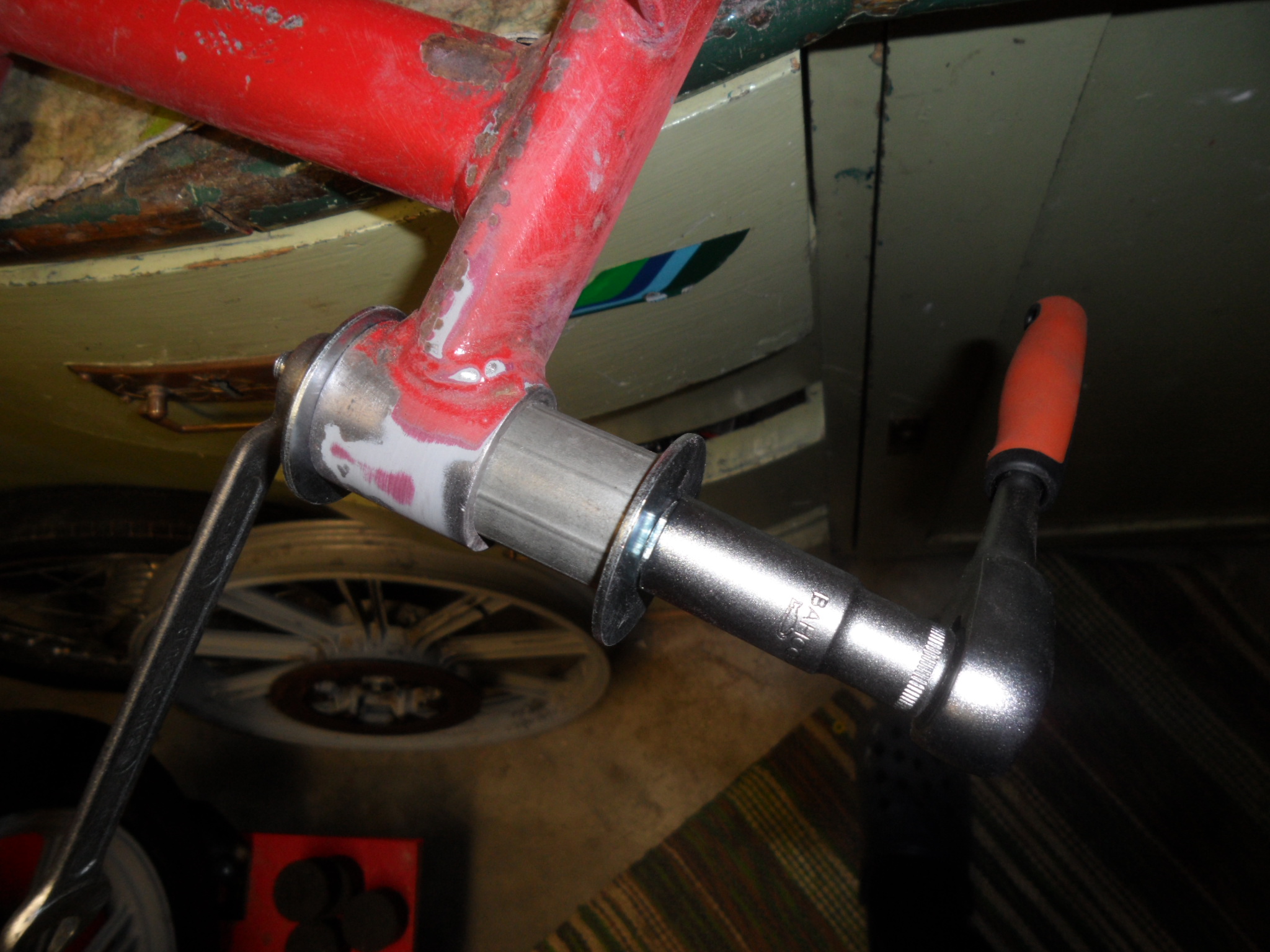 går ju fortfarande trögt med renoveringen..men lite färg har jag ju fått på de gammla gaffelbenen i allafall även fästena för verktygslådan i ramen är nu svetsade på plats...