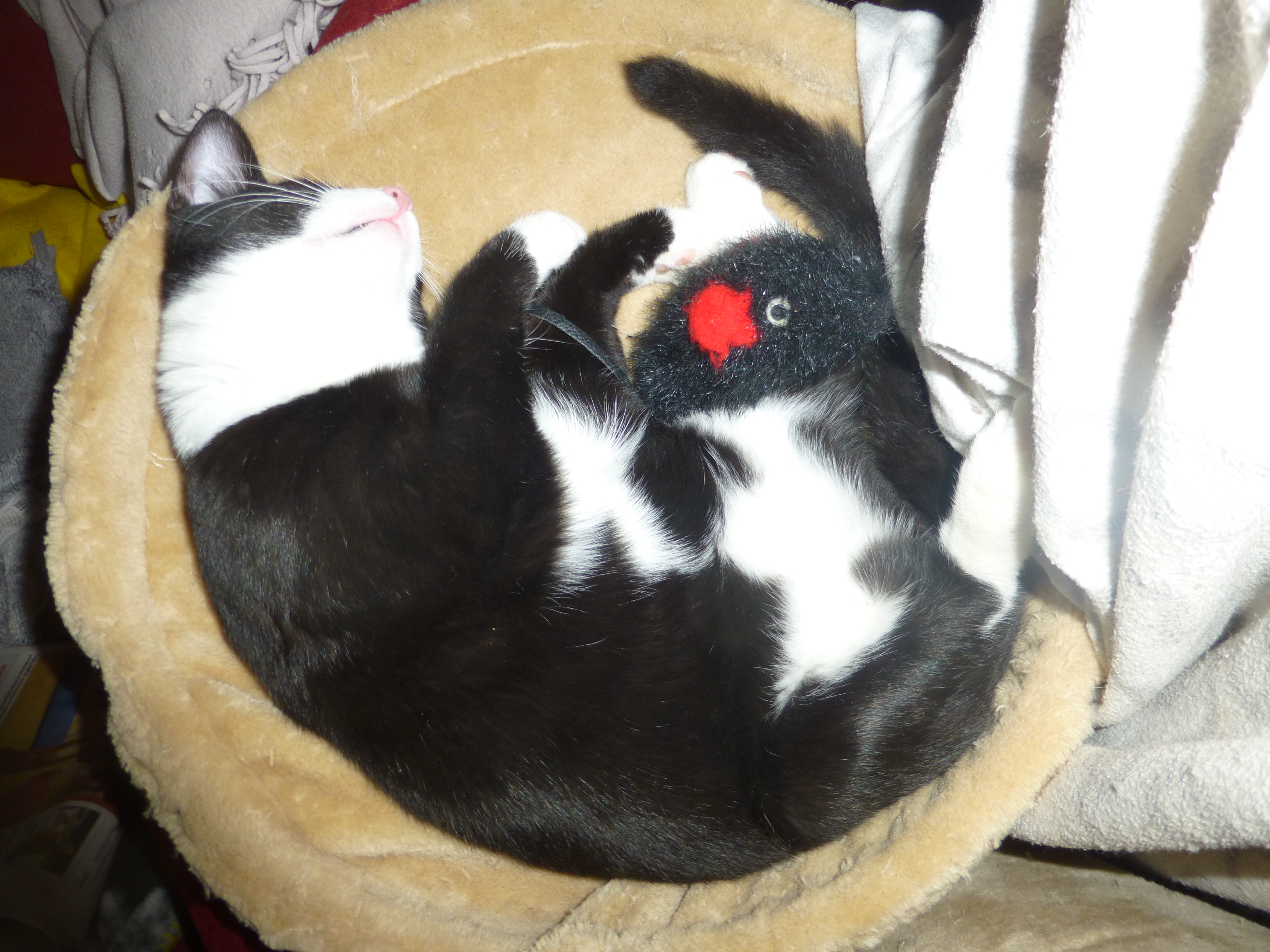 Våra nya familjemedlemmar Viktor och Pricken är nu vaccinerade och kastrerade, verkar helt opåverkade av det sistnämnda :D Här ligger Viktor och sover med en leksak i sängen...