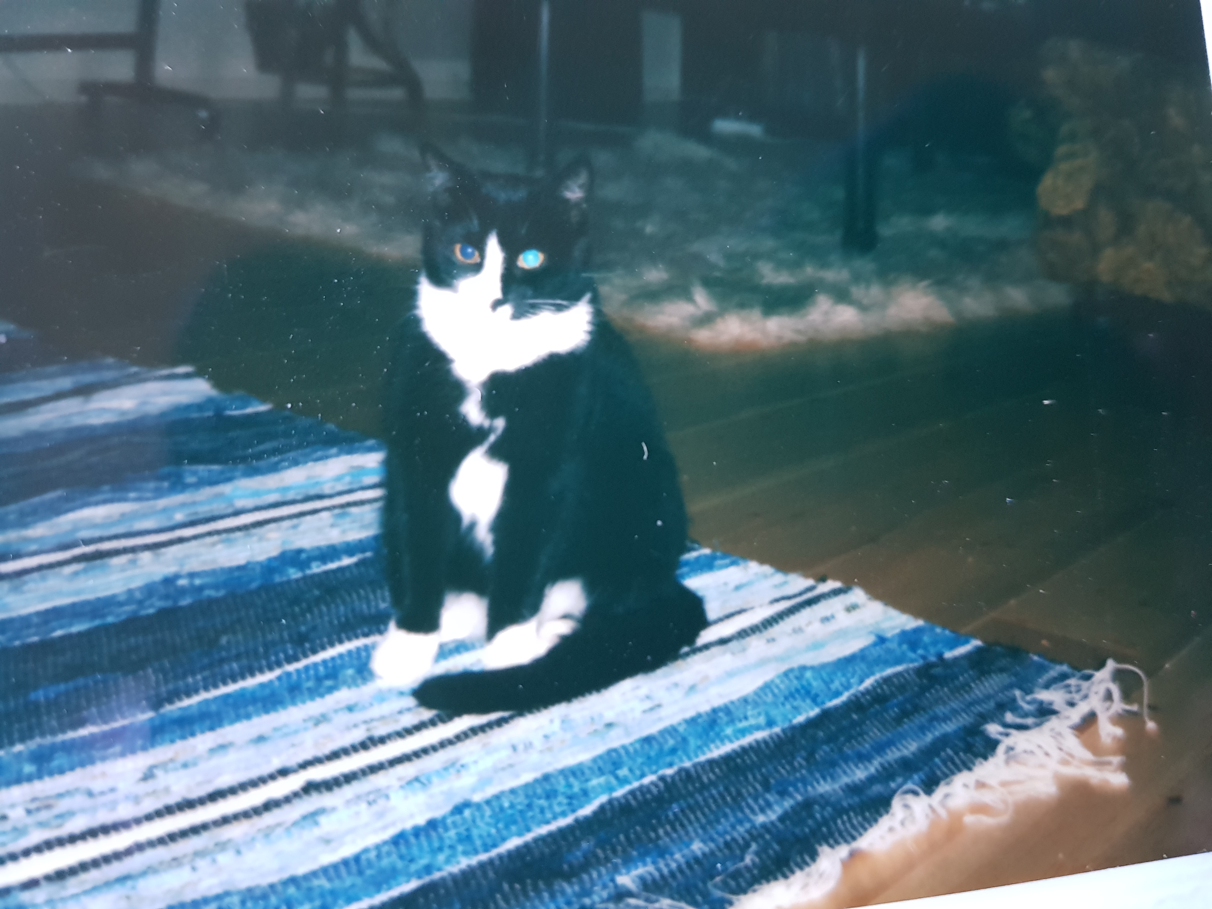 Här är en bild från runt 1981 när vi fick vår första katt, Katten. Han älskade att vara ute och jaga och små barn kunde bära honom upp och ner så ute var han hur snäll som helst. Inomhus letade han hela tiden möjlighet att ta sig ut och sprang runt och väste och hoppade upp på dörrhandtag. Jag hade honom ofta med i skogen där han gick lös och följde efter som en hund. Tyvärr gick han bort vid 10 års ålder efter att ha råkat bli instängd någonstans och kom hem efter någon vecka helt uttorkad så att han inte kunde räddas.