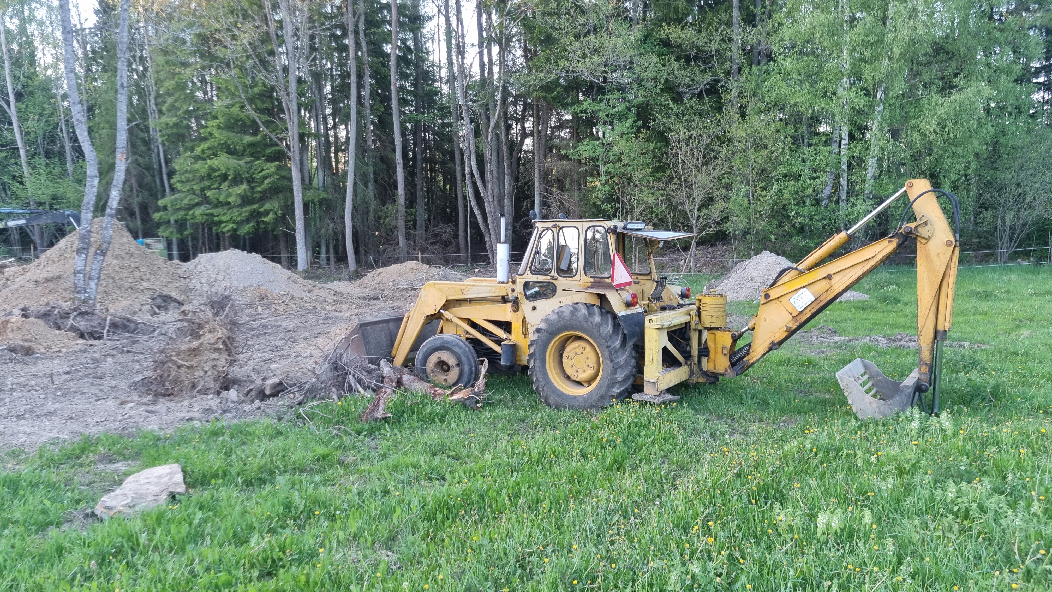 Stenar på 2-3 ton klarar inte min lilla slitvarg av så då får stora stygga Hymacken visa sig. Det är grannens Valmet som står i bakgrunden och plåten som saknas är bara tillfälligt på vifft då starthjälp behövdes på den, generatorn var kass.