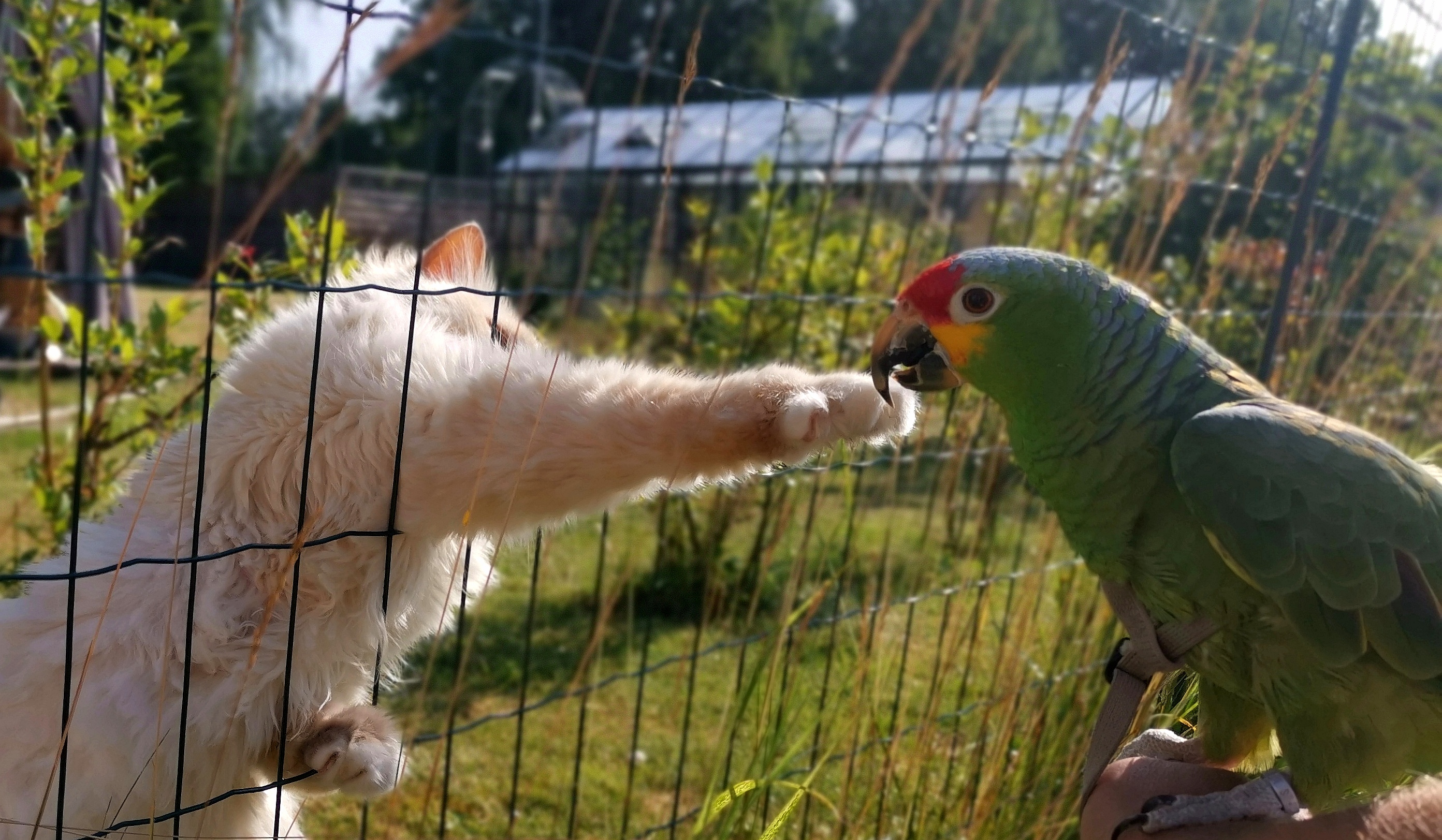 Cylinderborrarens katter var nyfikna och ville gärna hälsa på Emil, de har förstås aldrig träffat en papegoja förr för då hade de nog passat sig lite mer..