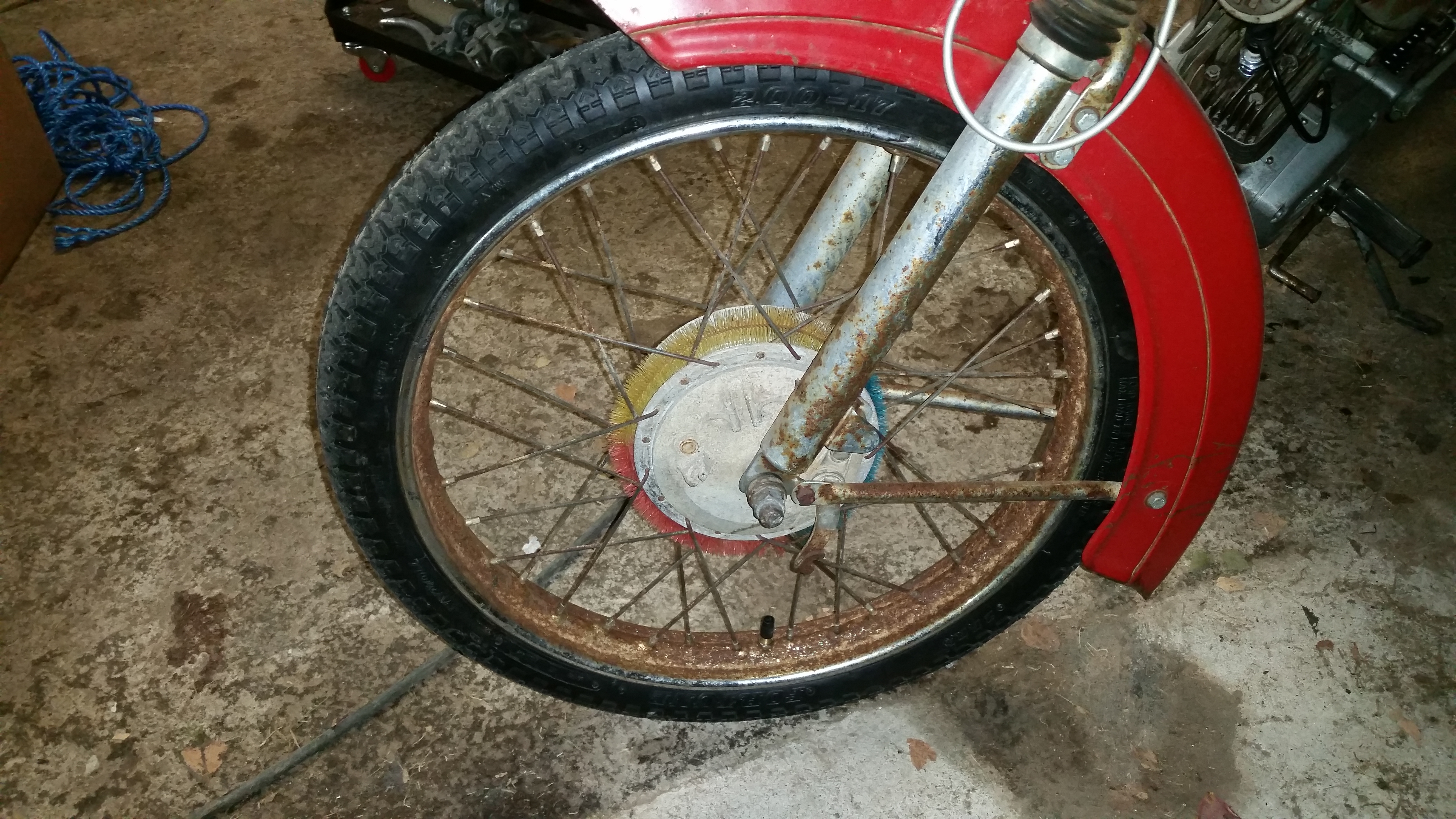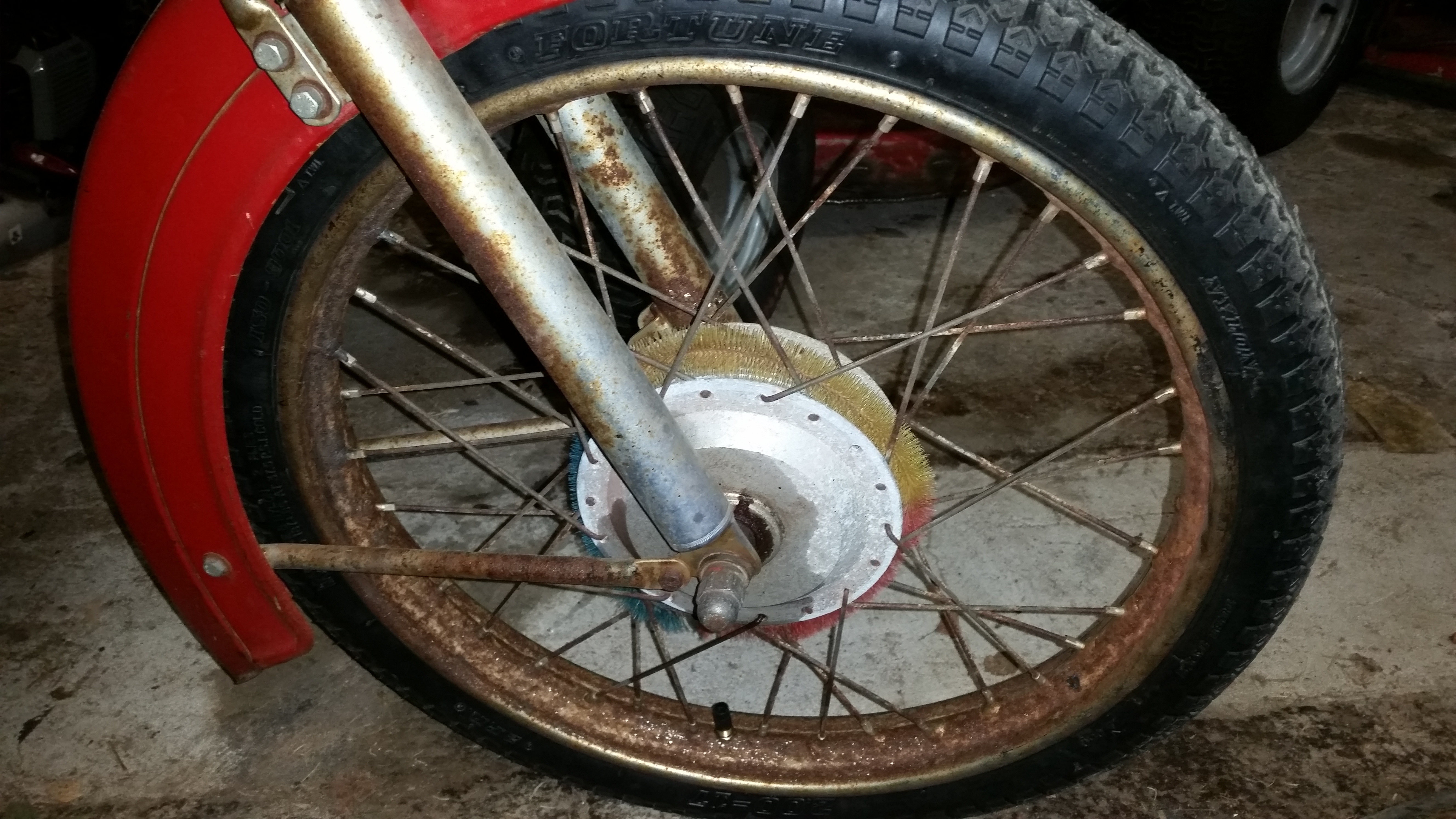 Framhjulets broms är ynklig tillochmed för originaleffekten. Receptet på det blir, som det ser ut nu, ett Leleu 120 nav som ska få sig en 19" bana. Detta mest för att lugna min kärestas oroliga nerver. Hon höjde min livförsäkring med ett par basbelopp efter att ha sett detta bygge...