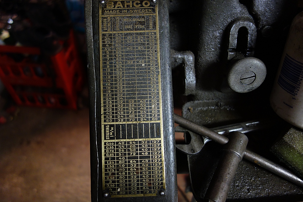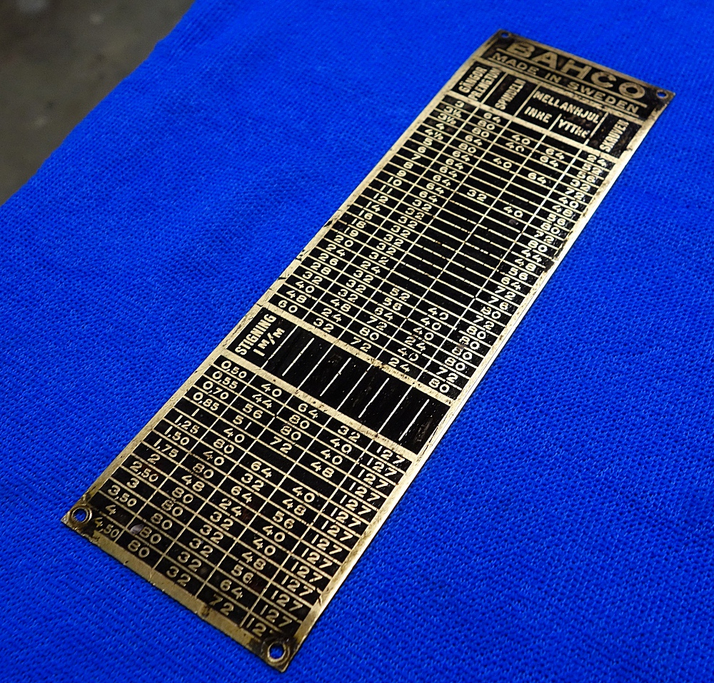 Skylten för drev kontra gängstigning såg blästrad ut och var svår att läsa med ledsyn trots att jag hade gjort rent den ordentligt med WD40. Så den fick en liten tillfixning m.h.a. svart permanent tusch och sedan ett par lager klarlack. Just den här skylten är ju lite av en dekor på Bahcon så den tog jag loss innan spindeldockan och allt annat som är klart nu ska målas i morgon.