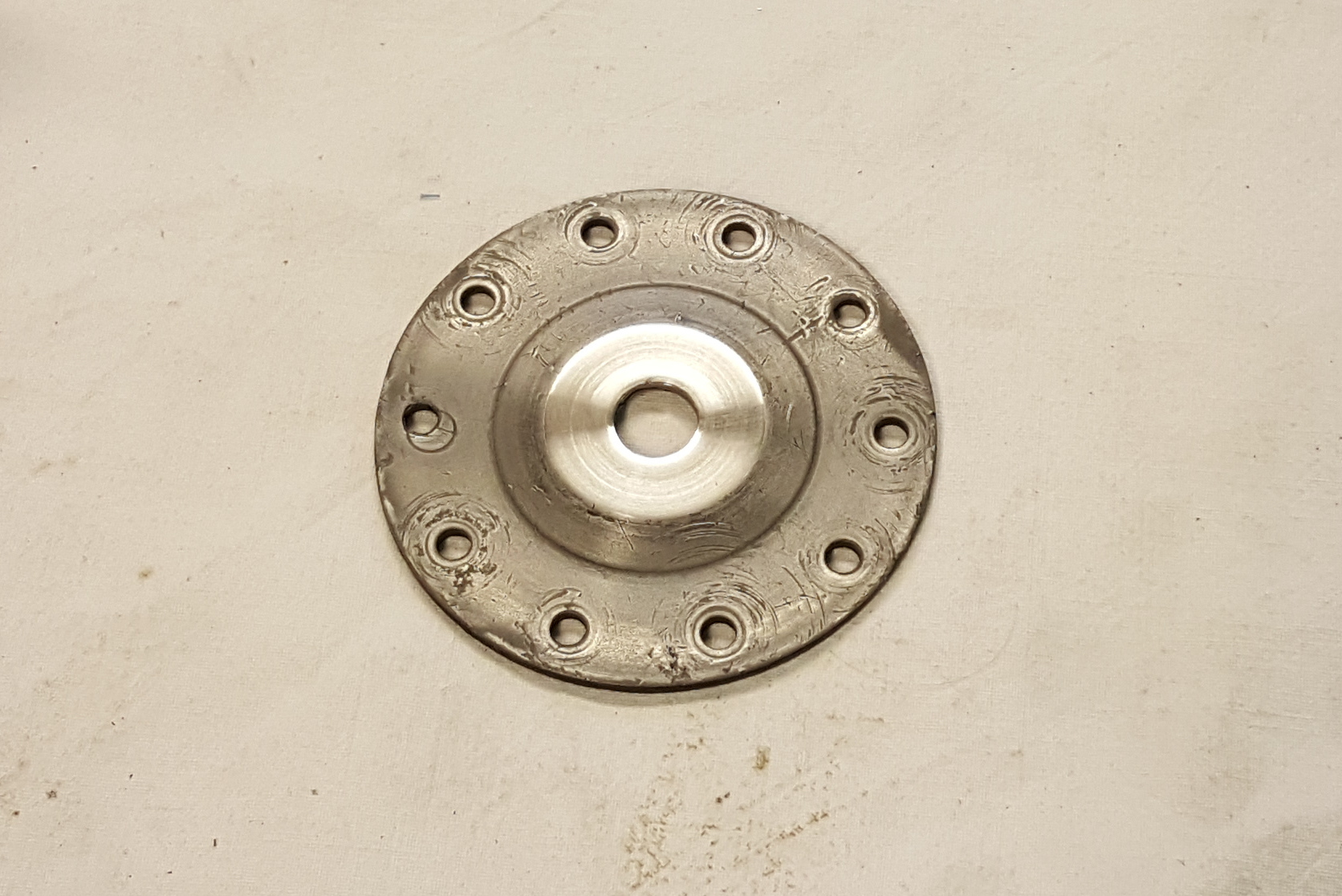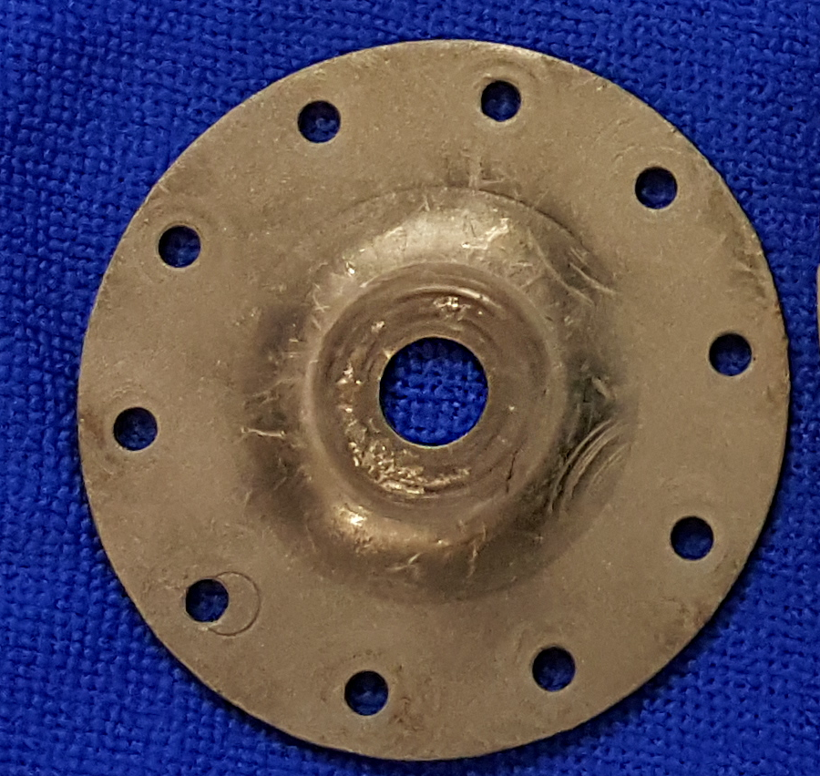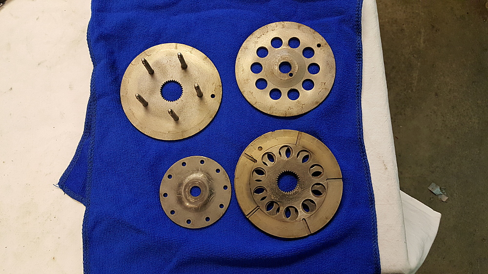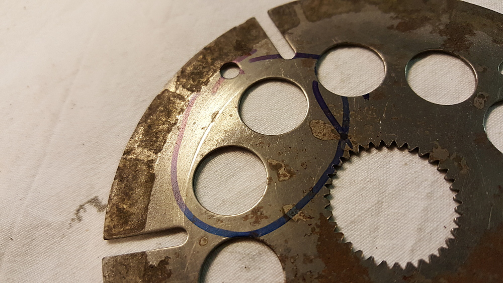 En av stålskivorna var rejält krökt efter att någon tidigare förmodligen har använt ett brytverktyg. Så den kasserades och ersattes men en skiva från skrotlådan till en 3-växlad motor. Springan som man ser på kortet är inte ett av de stora hålen utan att det lyser genom buktningen i skivan.