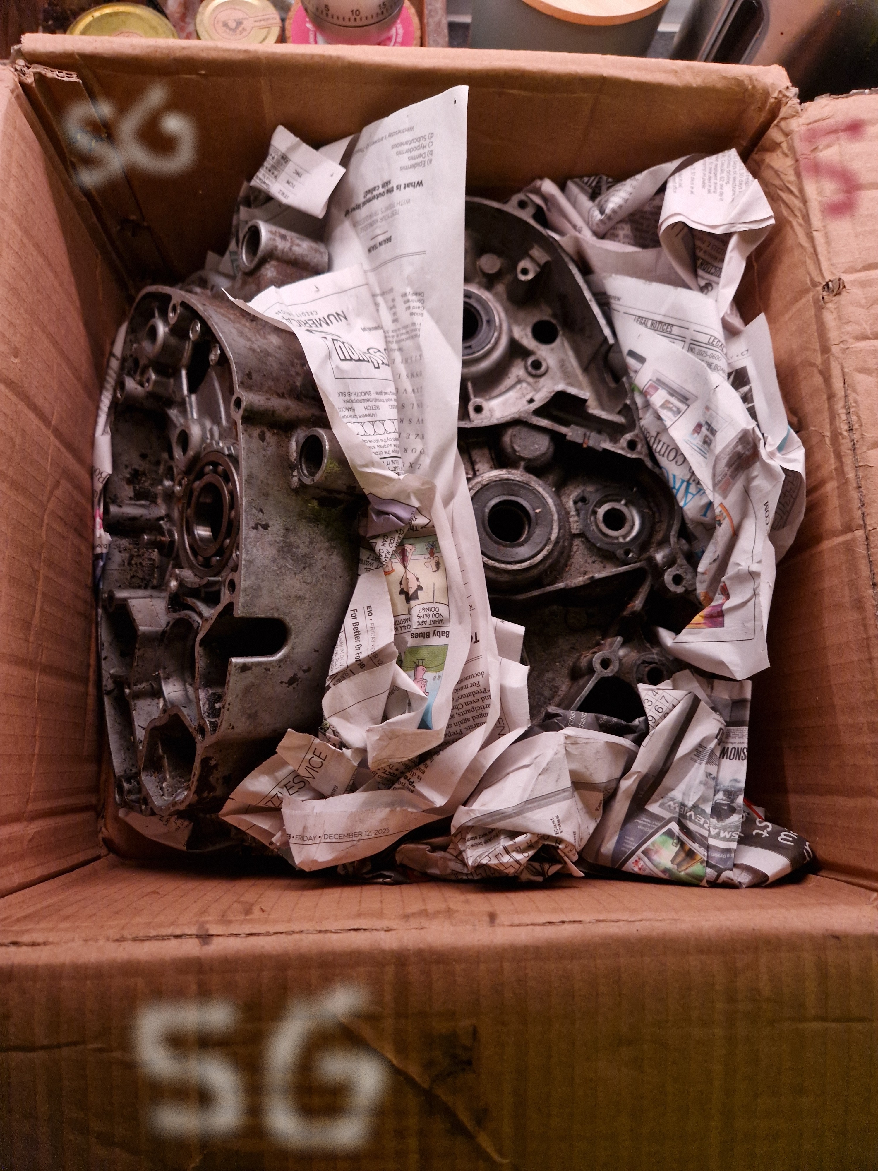 dröjde innan jag skar upp det paket, sen veckla upp bös och där var mina Suzuki K50 motor halvor. Nu sent så får undersöka dem imorgon.