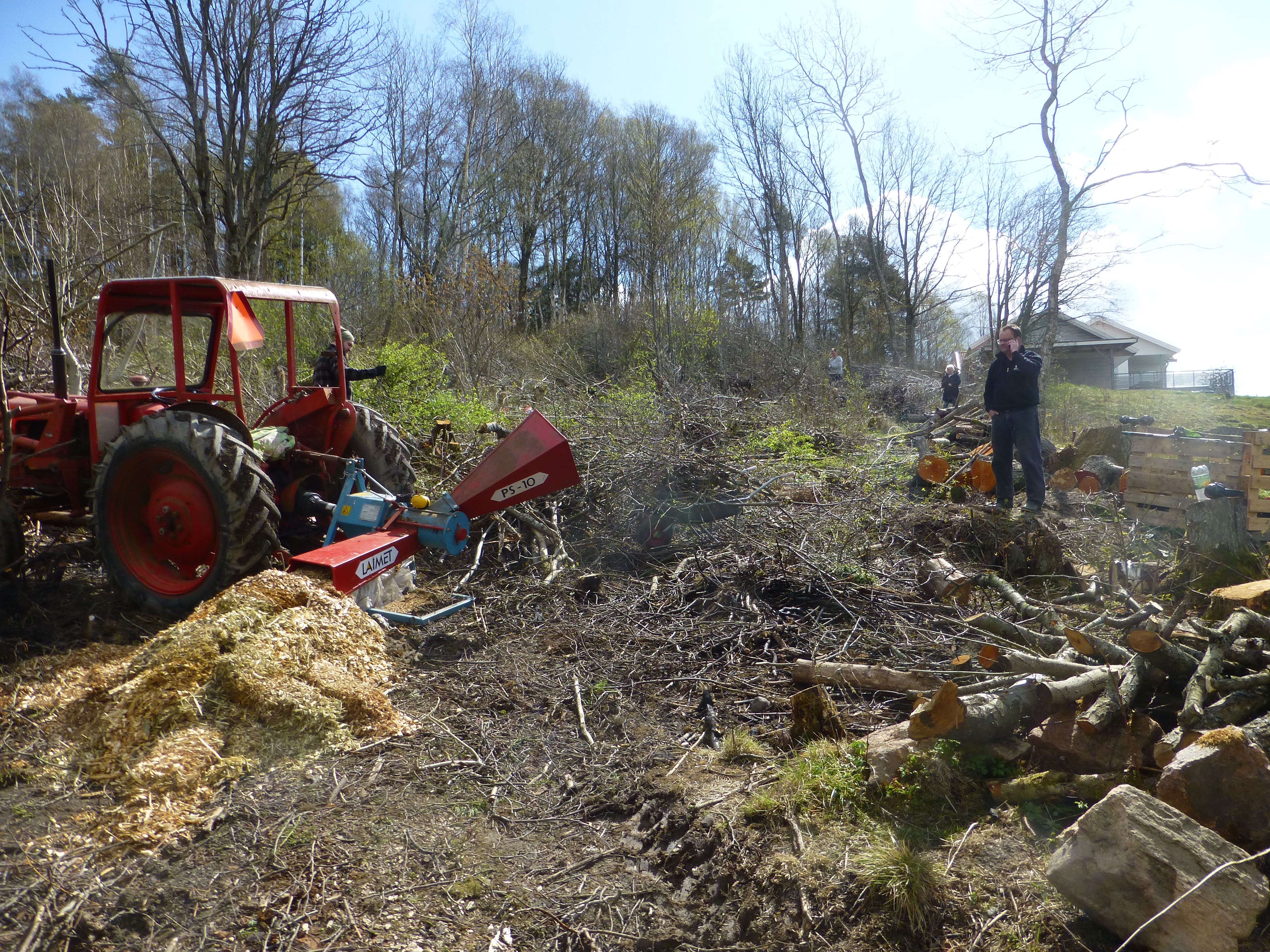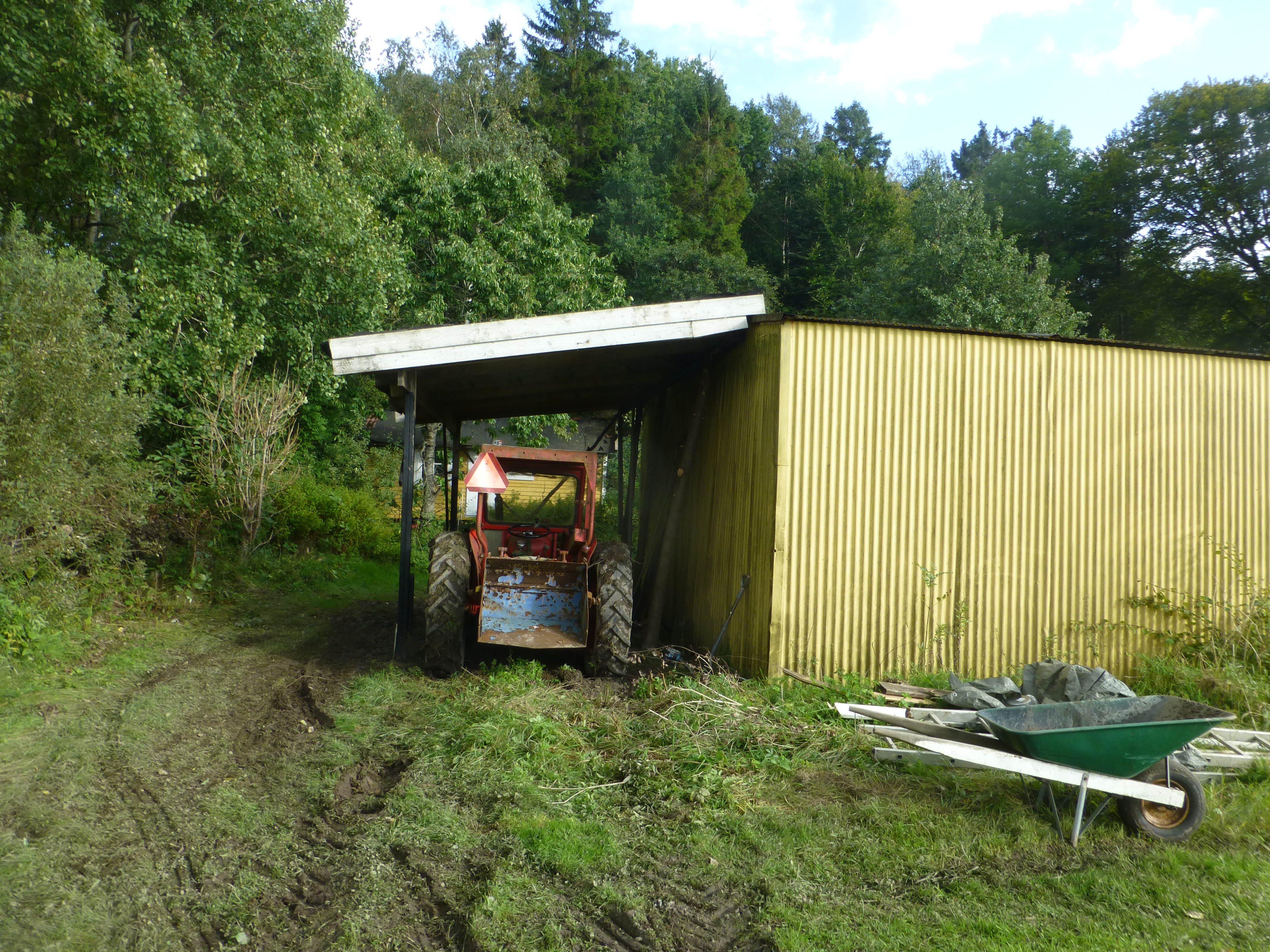 Om ni ser på bilden där vi flisar sly så ser ni grannens hus med ett snedtak närmat kameran, det snedtaket skulle bort för han skulle in med en grävmaskin där. Så jag högg det och monterade upp det hos mig så nu har min traktor fått tak över huvudet :D