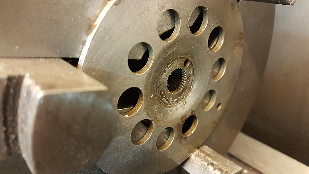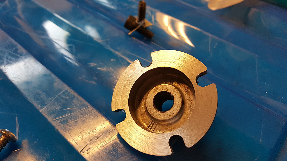 Den andra bilden är den yttre tryckplattan. Den var sårig på anliggningsytan för vikbrickan så den planades till i svarven. Plattan har nog gått utan bricka och skavts av muttern. I den här positionen använder jag en ny vikbricka. En annan konstighet med plattan var att orienteringshålet inte satt på rätt ställe så att fjäderkopparna gick fria. Men det var bara att lägga den så att hålen för fjäderkopparna linjerar med hålen i de övriga stålskivorna.