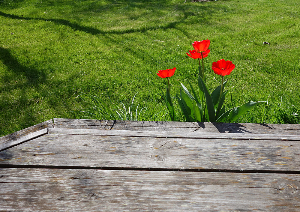 Jag antar att det är lika fint väder överallt nu och det är skönt att sitta ute och ta morgonfikat. På kanten till altanen har en Tulpan frösått sig själv och den får förstås vara kvar. En annan trevlig grej som uppskattas är skatorna som är i full action med att fixa ett nytt bo. Den enda som inte uppskattar det är katten som de håller efter när ungarna har fötts men det brukar alltid gå åt någon av dem ändå.Det ses tydligen inte som alltför allvarligt för skatorna har kommit tillbaka och byggt bo i minst 10 år.