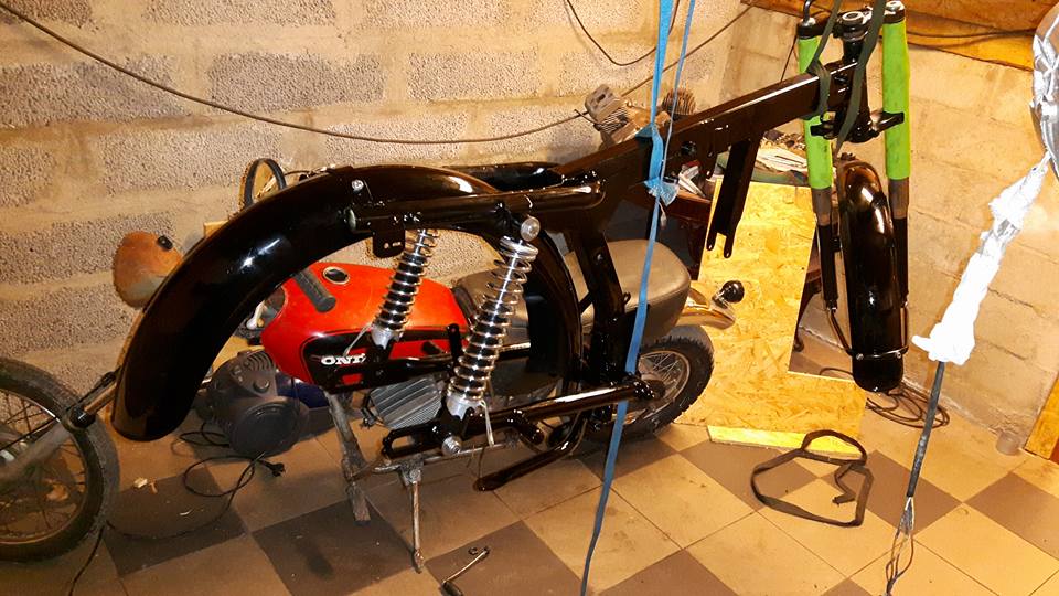 Helgen klar för denna gången... Då det vart jourhelg så lite arbete fått gjorts i helgen!! Men ändå hunnit med lite moppe!! Fått ihop och på framgaffeln skärmar o de nyrenoverade konidämparna!! Dess utom fått ihop en framfälg dock med hemläxa!! Måste slipa bort färg från bromsytor!! Det och lite sprayburkslackering av småpryttlar blir kvällens hemläxa!! Ändå nöjd lite mer än inget!!