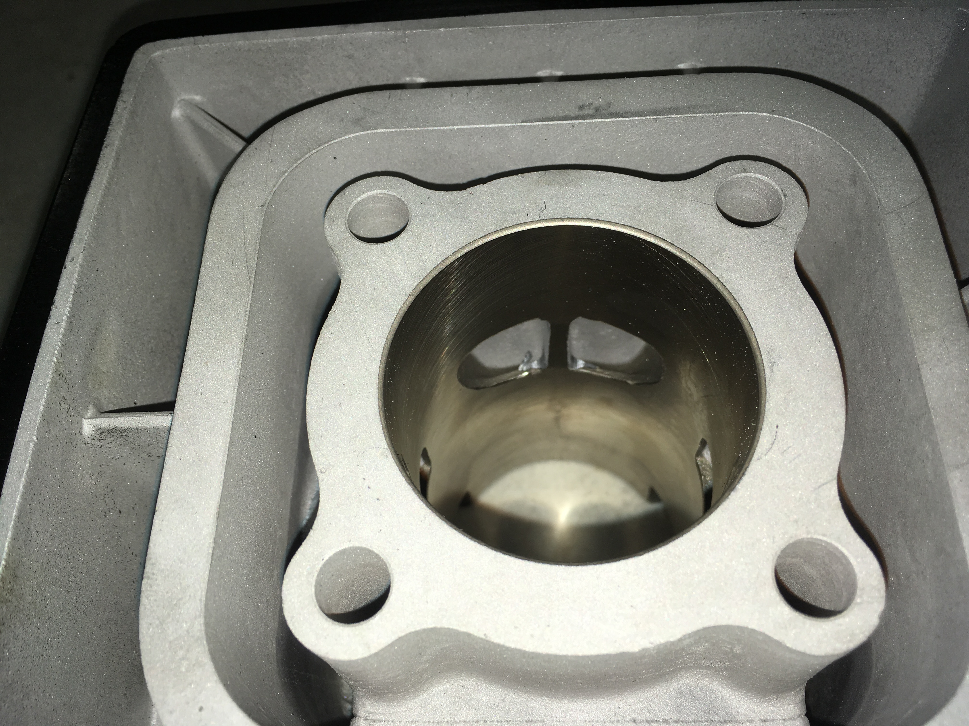 Ikväll packade jag upp den nya cylindern, det är en 92cc (50mm borr) med reedstyrt insug. Jag tycker kvalitén är riktigt bra med tanke på att det är en kinatillverkad eftermarknadsdel. Förutom att insuget är annorlunda och den har boostkanaler så är även utblås och spolkanaler betydligt större än original.