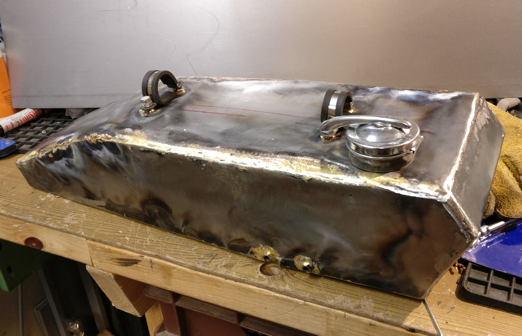 Tanken är nu "helt" ihopsvetsad (och -lödd). Jag lär inte få några pris för bäste svetsare men det blir bättre hela tiden! Tänkte försöka täta med mässinglod. Eller är det en jättedålig ide?