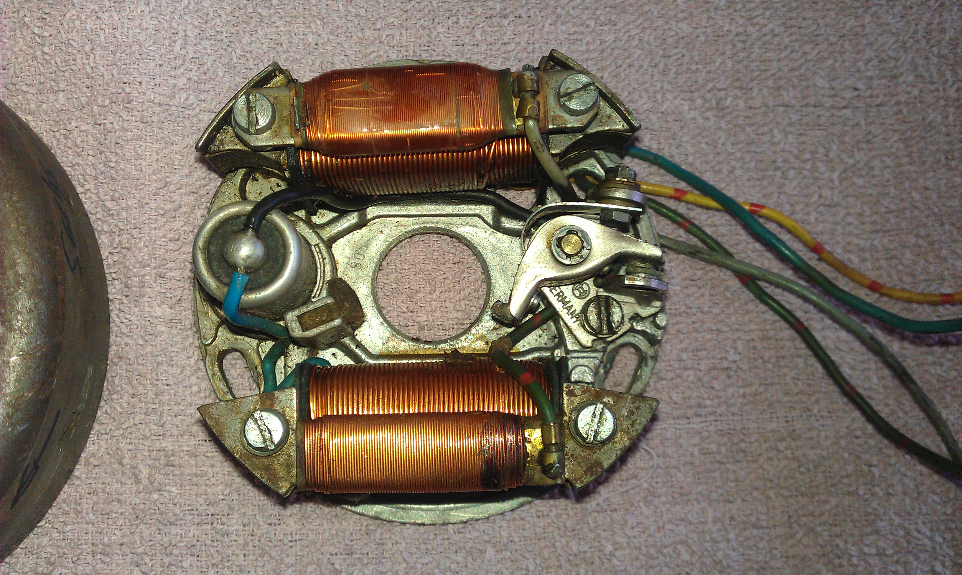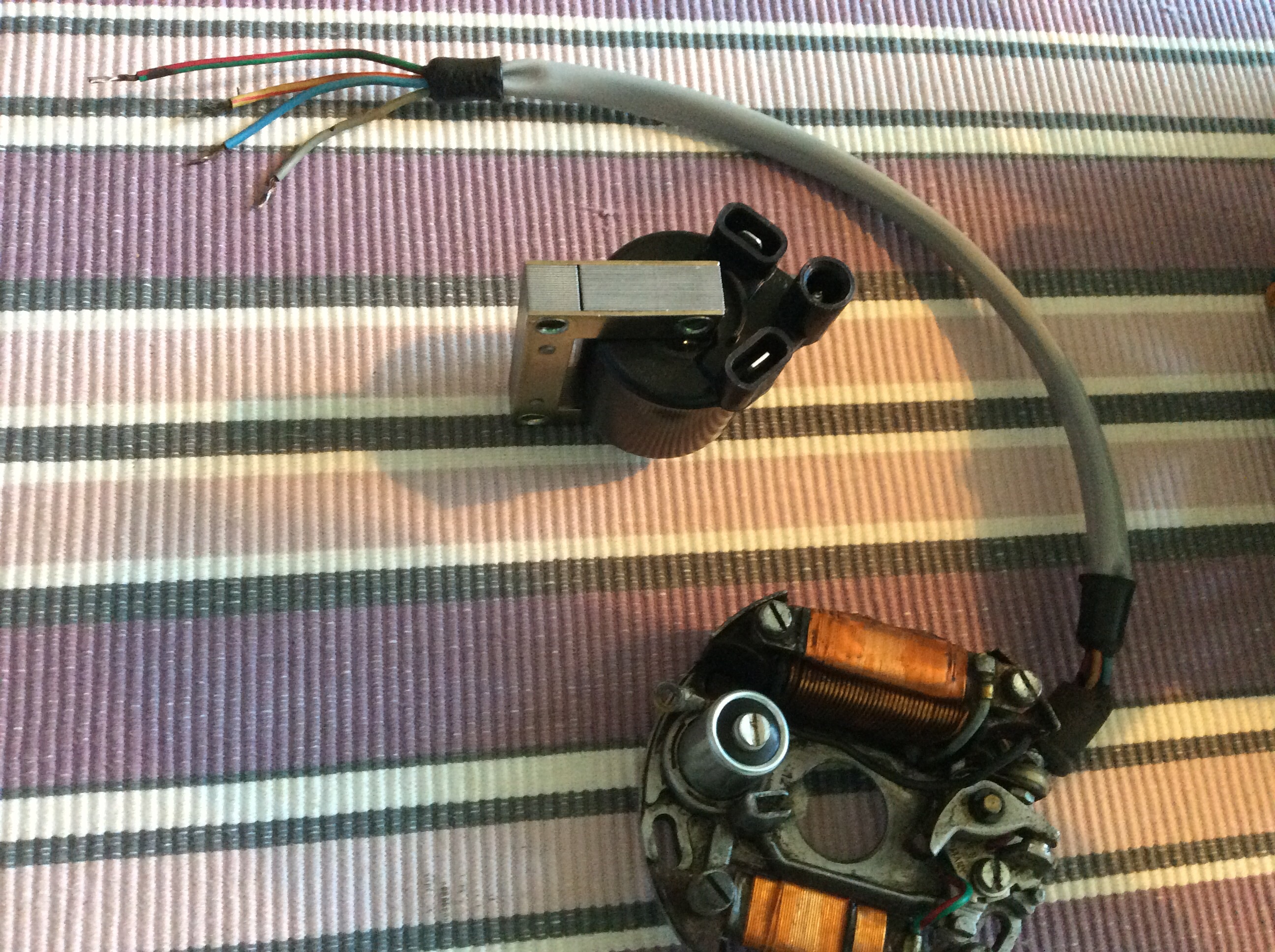 Så här är nog färgerna på kablarna original...Fyra spolar. 2 st stora + 2 st mindre 6V 35/18/5W