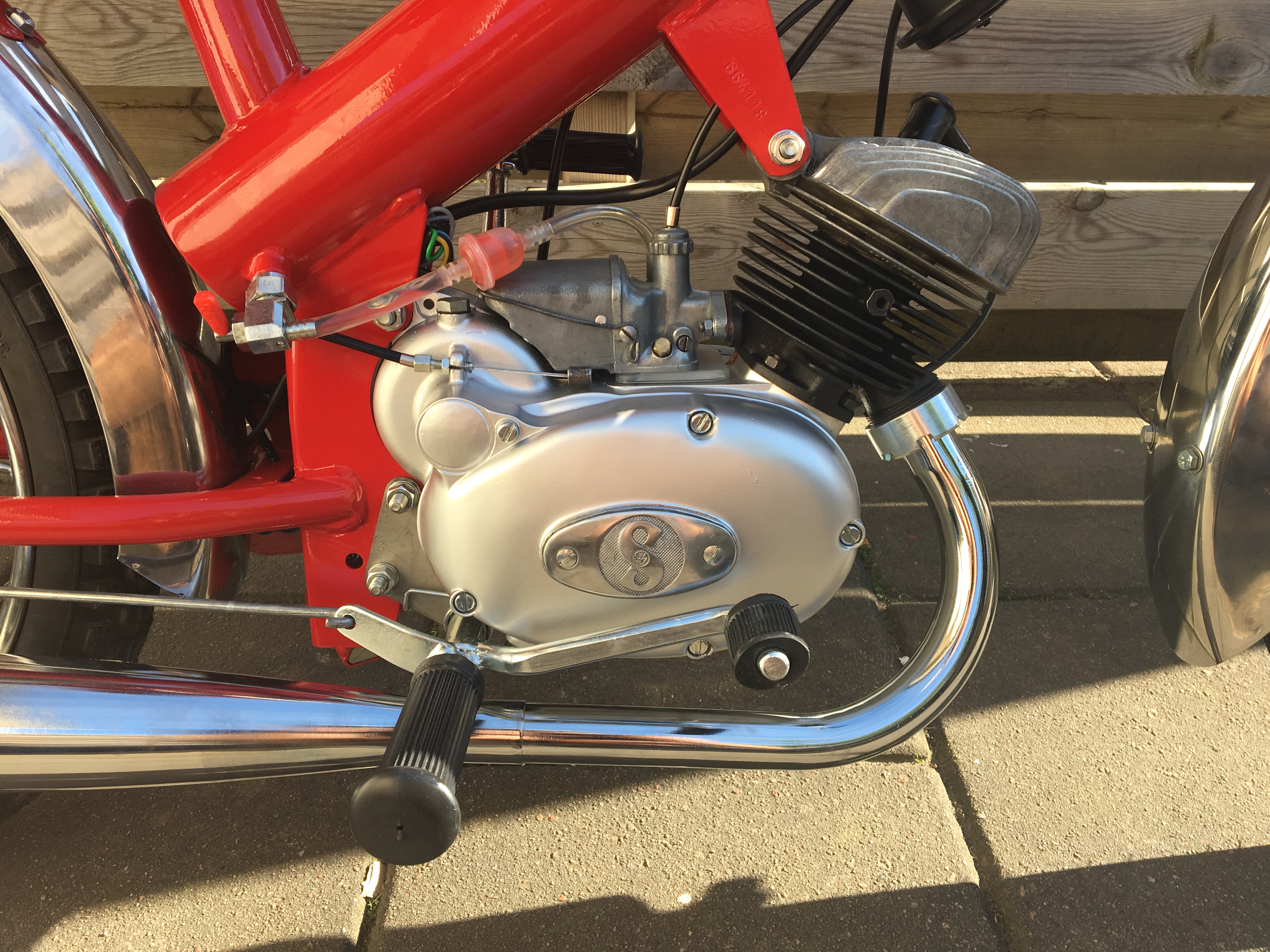 Håll i hatten, fick tid över efter jobbet idag för lite montering av diverse, hängt dit kabelstammen och börjat koppla in den, monterat dit avgassystemet, bytt fotpinnen till rätt modell som inte pekar i himlen. blir samma princip som jag kör på min Compact, istället för 32mm avgasrör + dämpare blir det reduceringsmutter från 32mm till 28mm avgaskrök med NOS 28mm 65mm sachs ljuddämpare, denna är gjord för högre effekt uttag än 1hk. Orginal på svenska mopeder var 28mm 55mm (Raketare har denna modell av ljuddämpare bla) Norge 28 - 65mm (40km/h) och sen fanns det 32mm- 65mm (Mcb orginal lätt mc trim, det som orginal till 4,3hk cylindern egentligen är till, såldes till bla 50ss) mycket svåra och hitta dock.. letar själv efter än. 8)