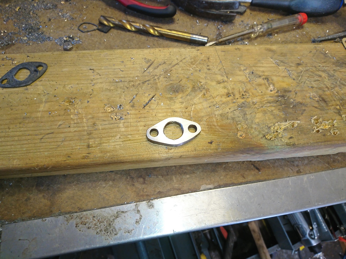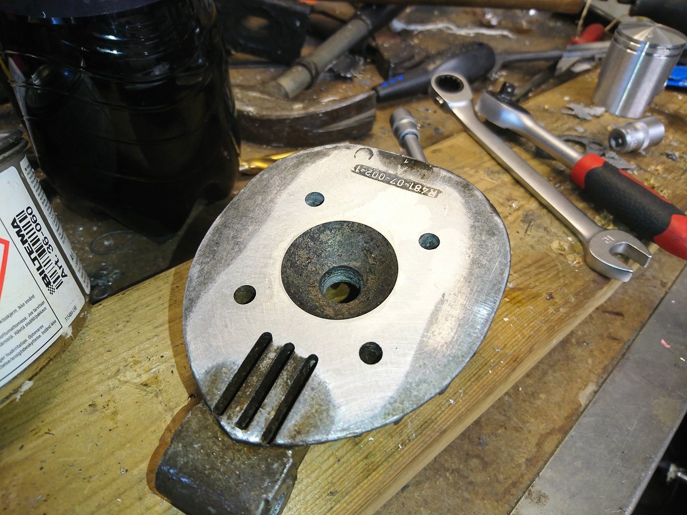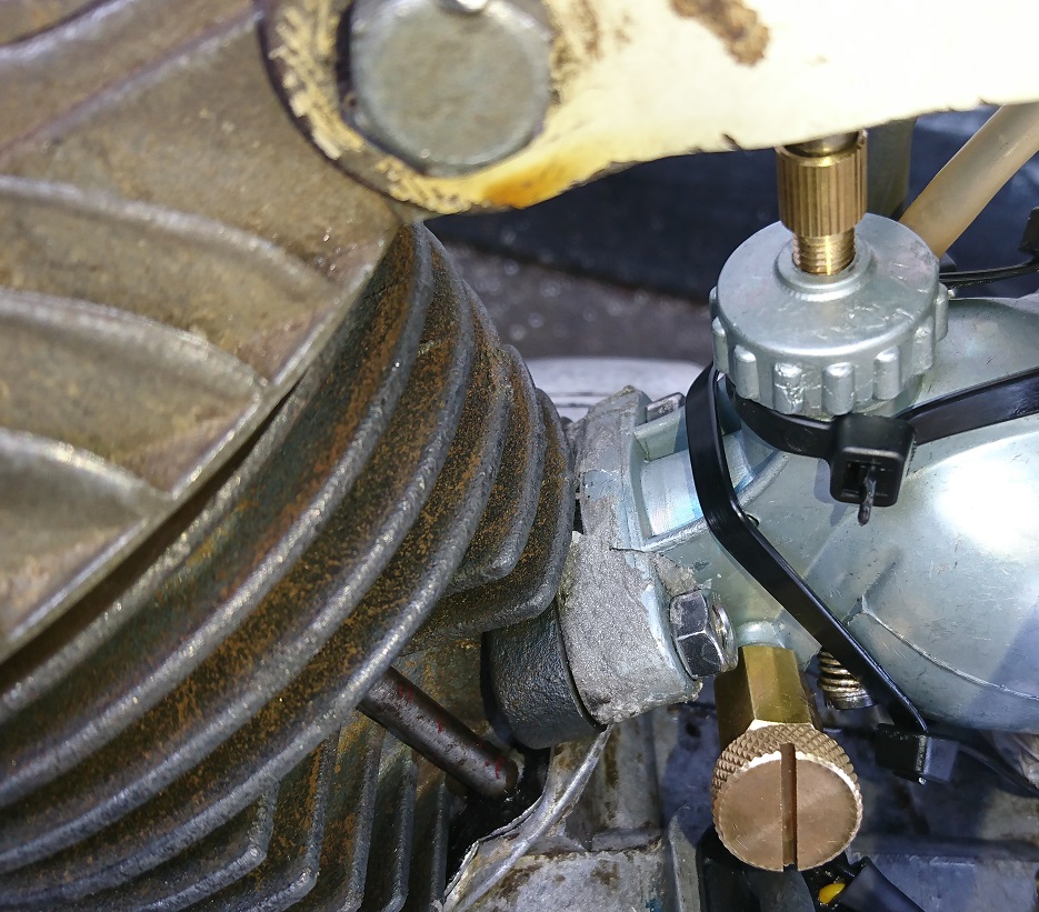 Nu har jag tillverkat en bricka som jag limmat fast på förgasaren med kemisk metall, tillsammans med det avknäckta örat. Håller det så håller det, om inte får det bli en ny förgasare