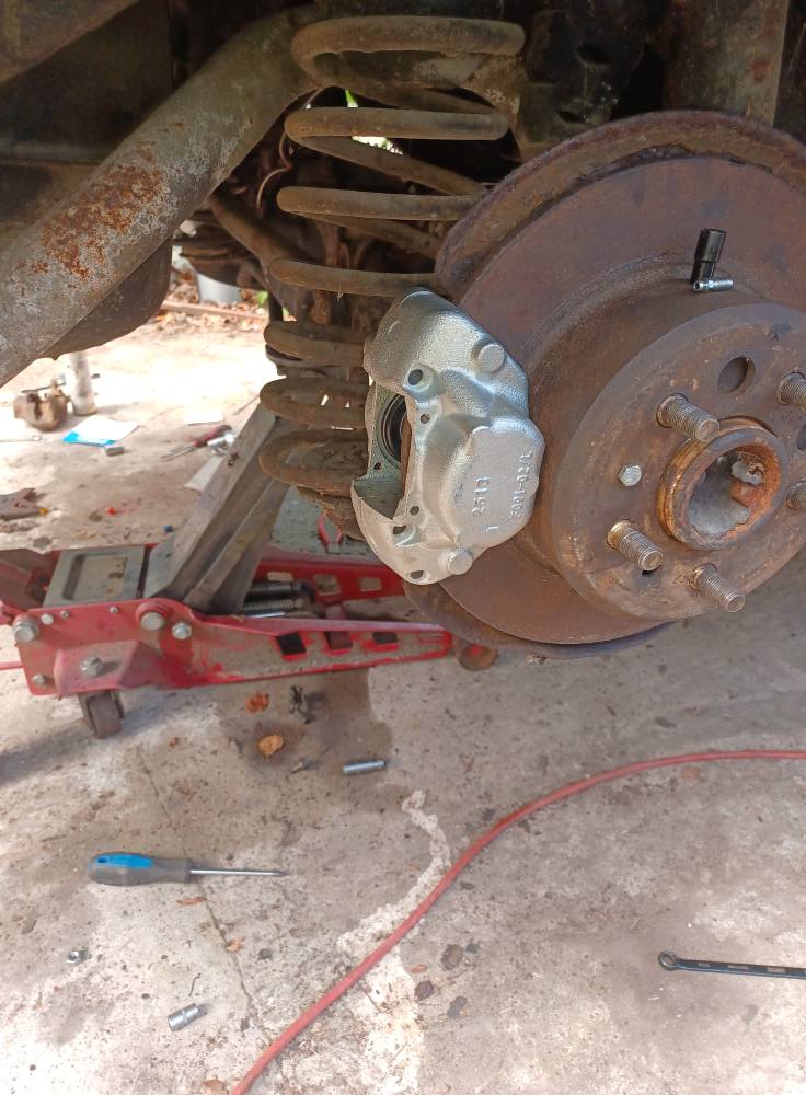 så äntligen slut på bromsjobbet bak. Vänster sida vart nytt ok slang rör nya handbromsbackar en stjärnjustering samt expander och ny Handbromsvire.. Höger sida vart lite trassligare att lufta då de fyndigt billiga paret bromsok jag hittade på en marknad visade sig vara 2 vänster-ok.
