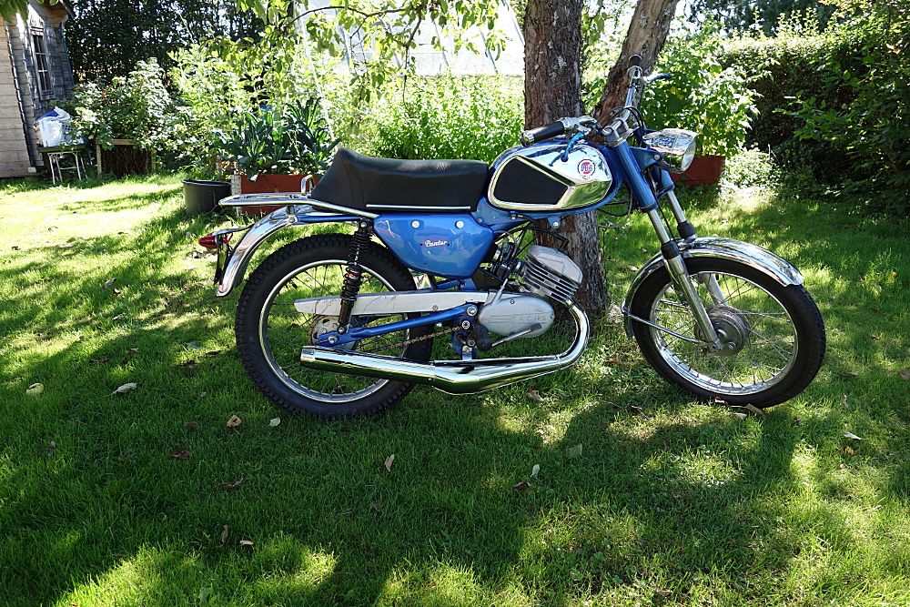 Så här såg lösningen för luftfilter och anslutning ut som jag gjorde till en DBS som jag hade. Med monterad sidokåpa är det inget iögonfallande. Moppen gick helt okey och killen som köpte den kunde sitta upprätt och köra om Zundappgubbar med trim som låg på tanken i 100+